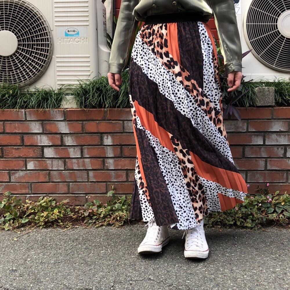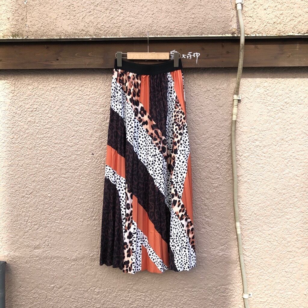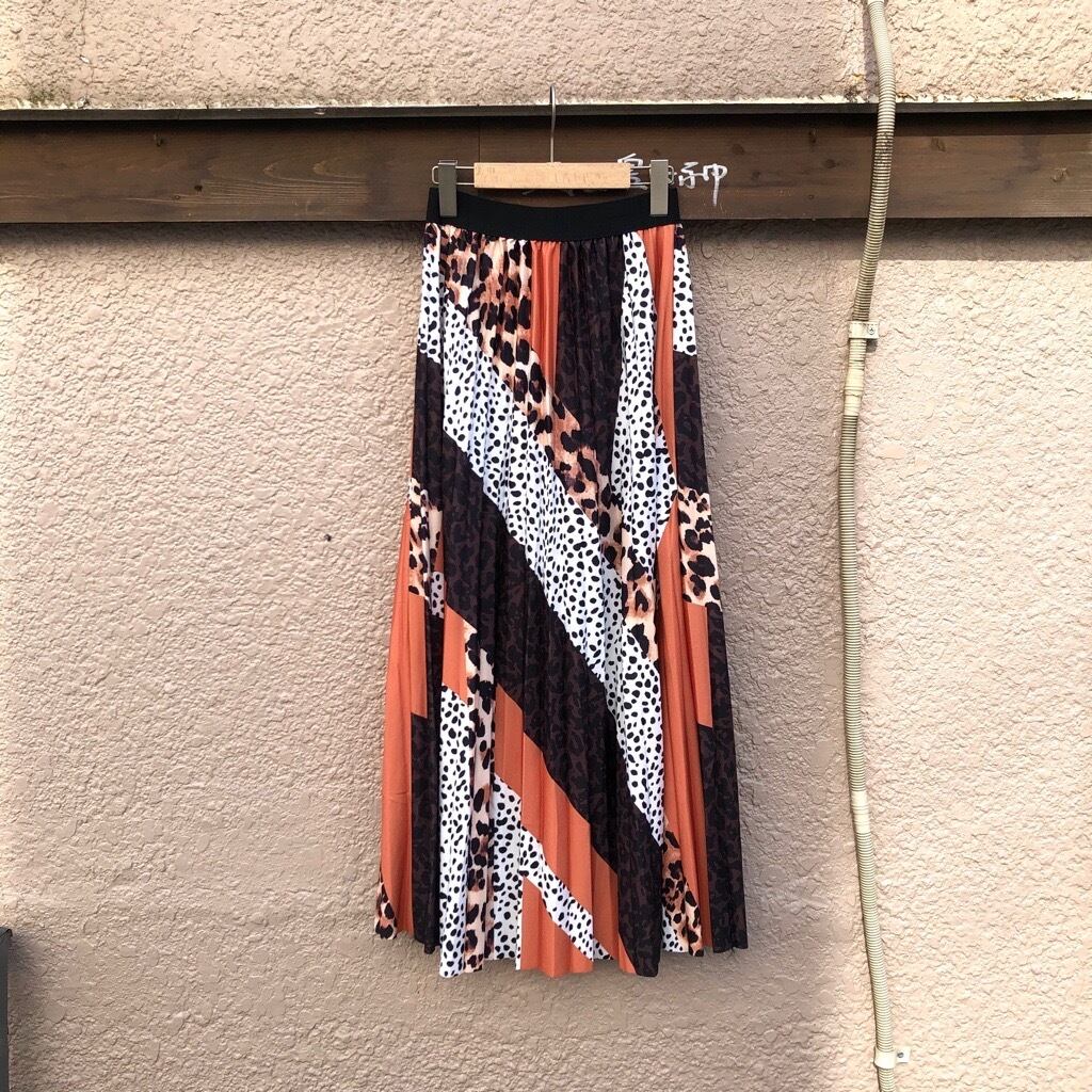 様々なレオパード柄が楽しめるプリーツスカートです。裏地がなくても全く透け感のない生地にプリントされた様々なレオパード柄がライン状に配色されており、プリーツも相まって動きの楽しめる一枚です。