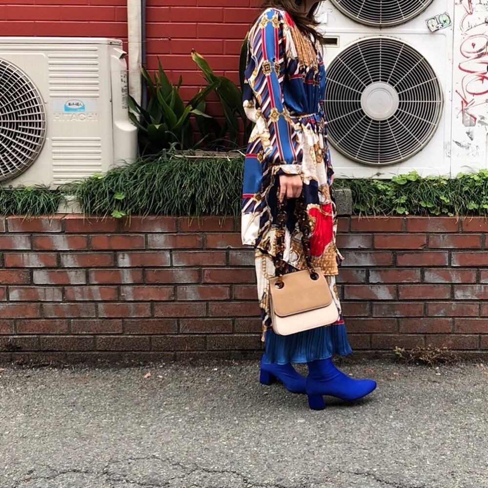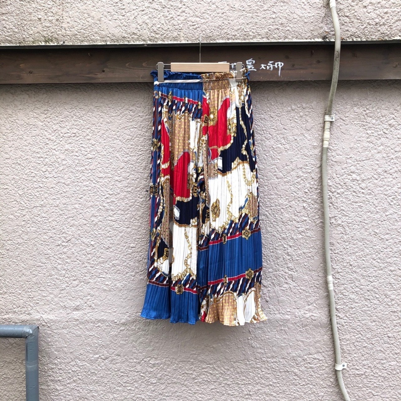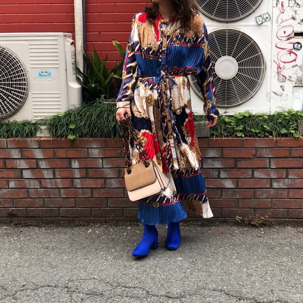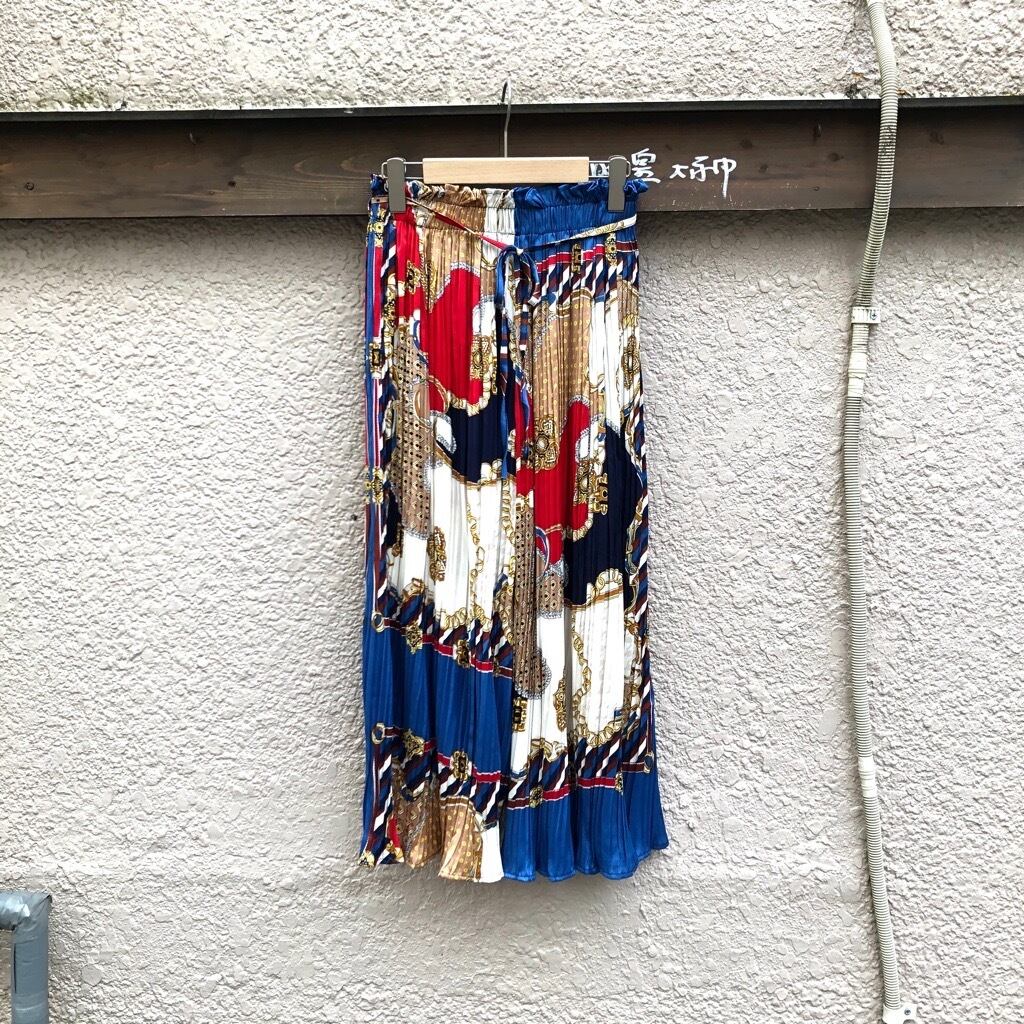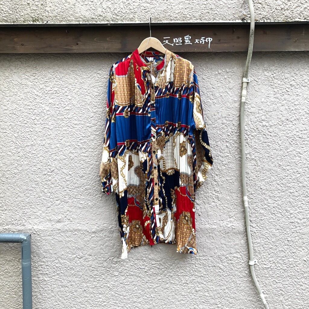 大胆なスカーフの総柄プリントが目を惹くノーカラープリーツシャツとプリーツパンツのセットアップです。やや大きめのサイズ感なので、長めの着丈のトップスはウエストマークでパンツと合わせてワンピースのようなシルエットに。それぞれ別々に着ていただいてもコーディネートのアクセントになるアイテムです。