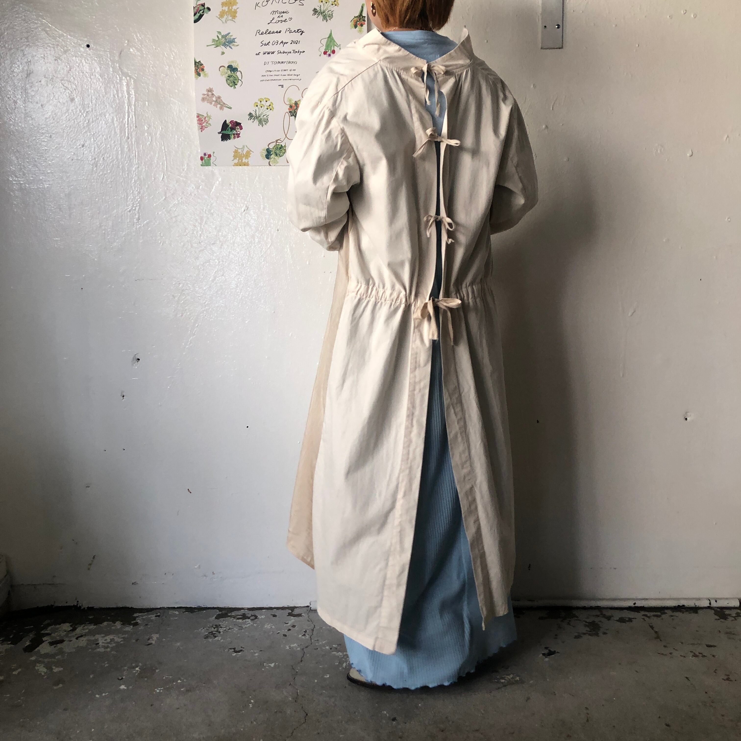 メディカルガウンは手術着なので後ろ開きが基本ですが、ガウンのように着ても可愛く、着にくさはないです。サイドにコットンシルクを入れ、身幅やウエストを広げてゆったりとした着こなしも可能です。微かな透け感が綺麗な、羽織でもワンピースとしても着れる1枚です。