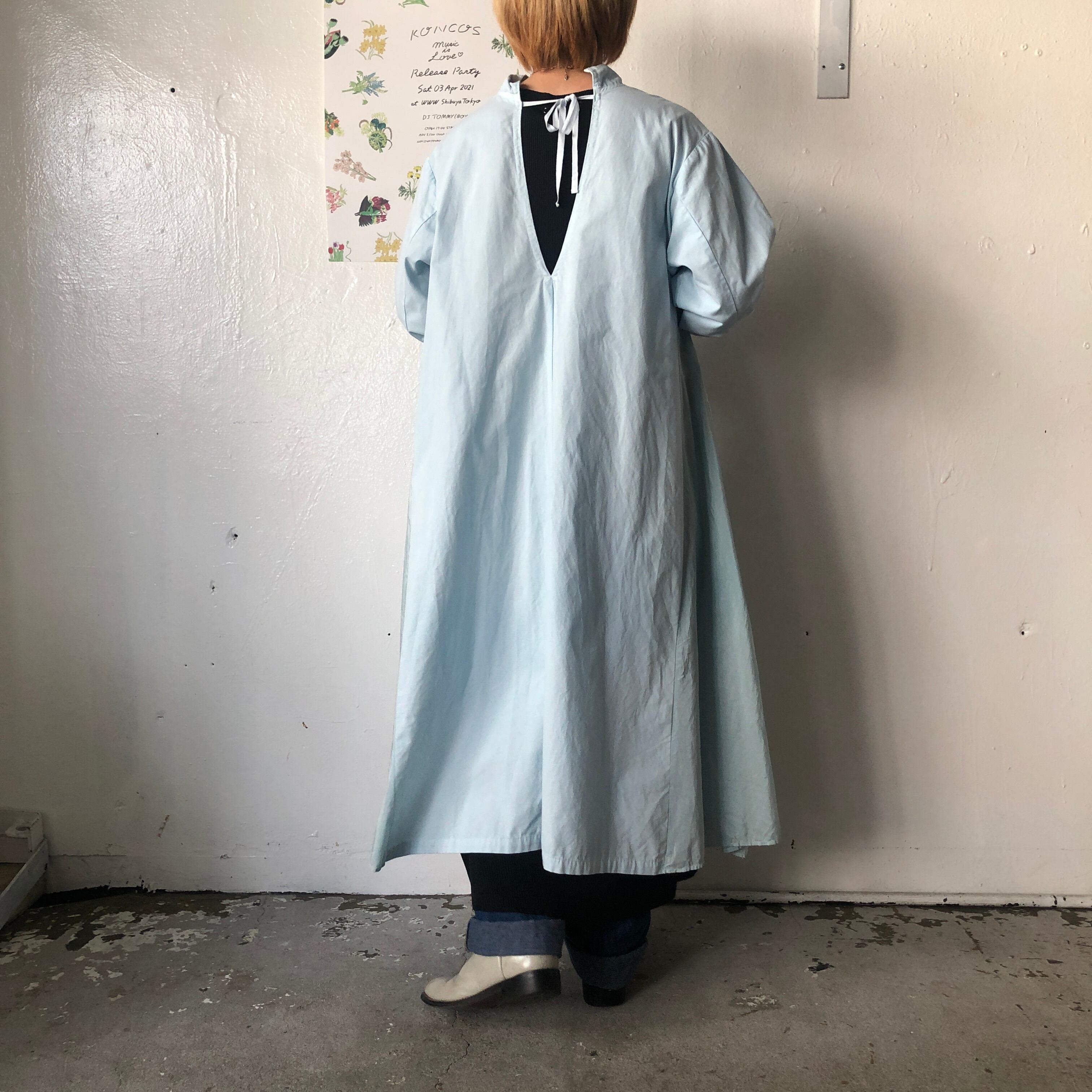 メディカルガウンは手術着なので後ろ開きが基本ですが、ガウンのように着ても可愛く、着にくさはないです。サイドにコットンシルクを入れ、身幅やウエストを広げてゆったりとした着こなしも可能です。微かな透け感が綺麗な、羽織でもワンピースとしても着れる1枚です。