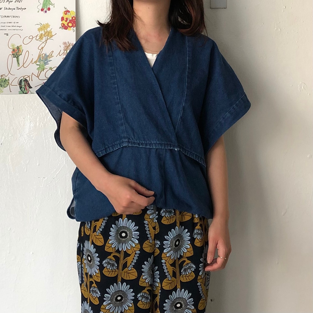 古着のイージーデニムパンツをリメイクした、オリジナルトップスです。