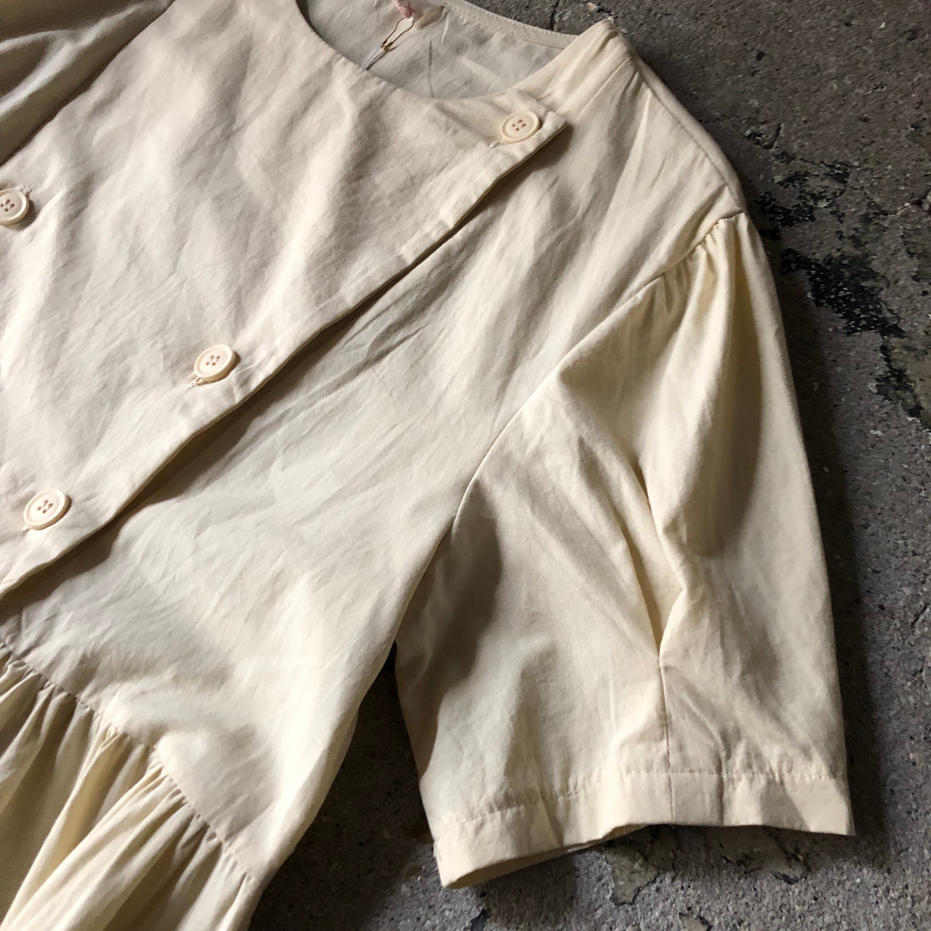 胸元に連なるダブルボタンのカジュアルさと腰回りの細かいギャザーが女性らしいコットンワンピースです。