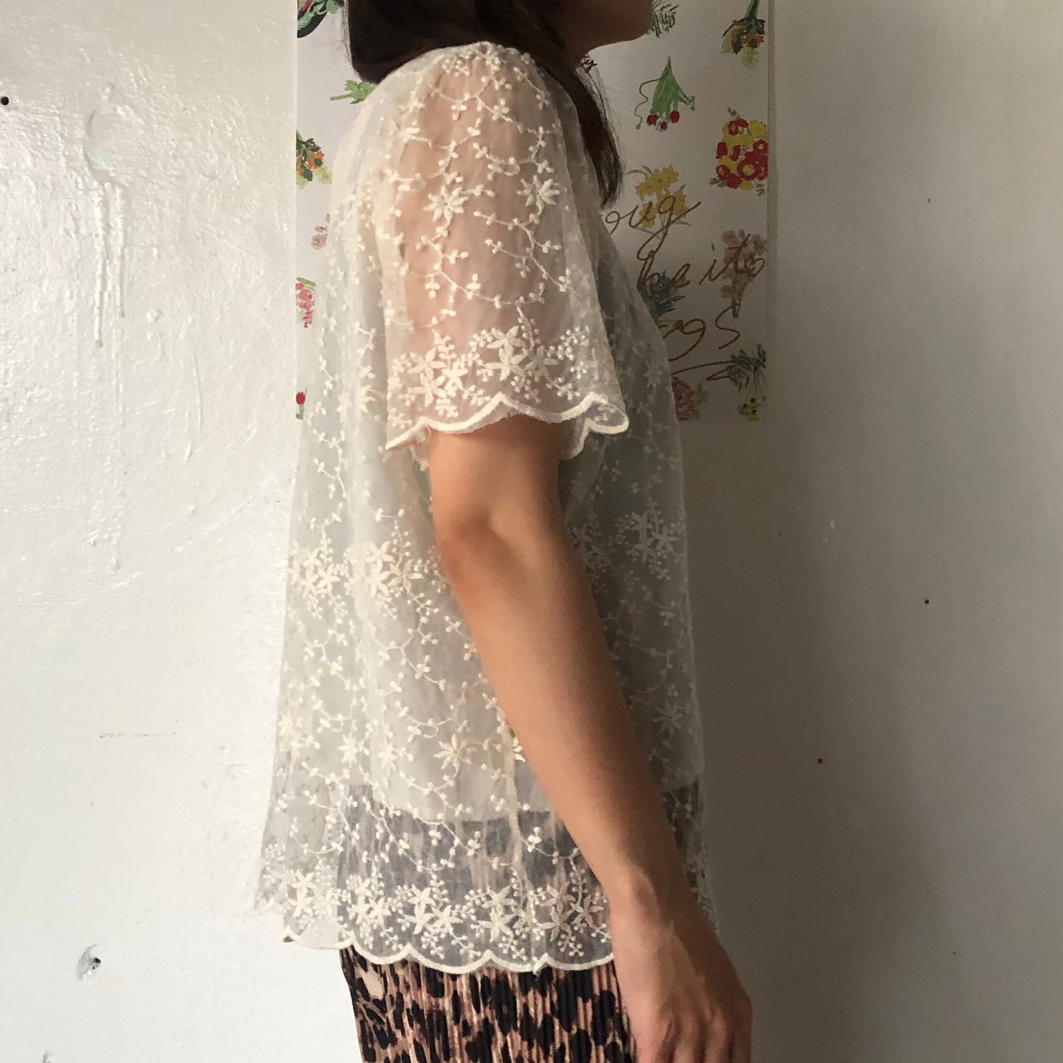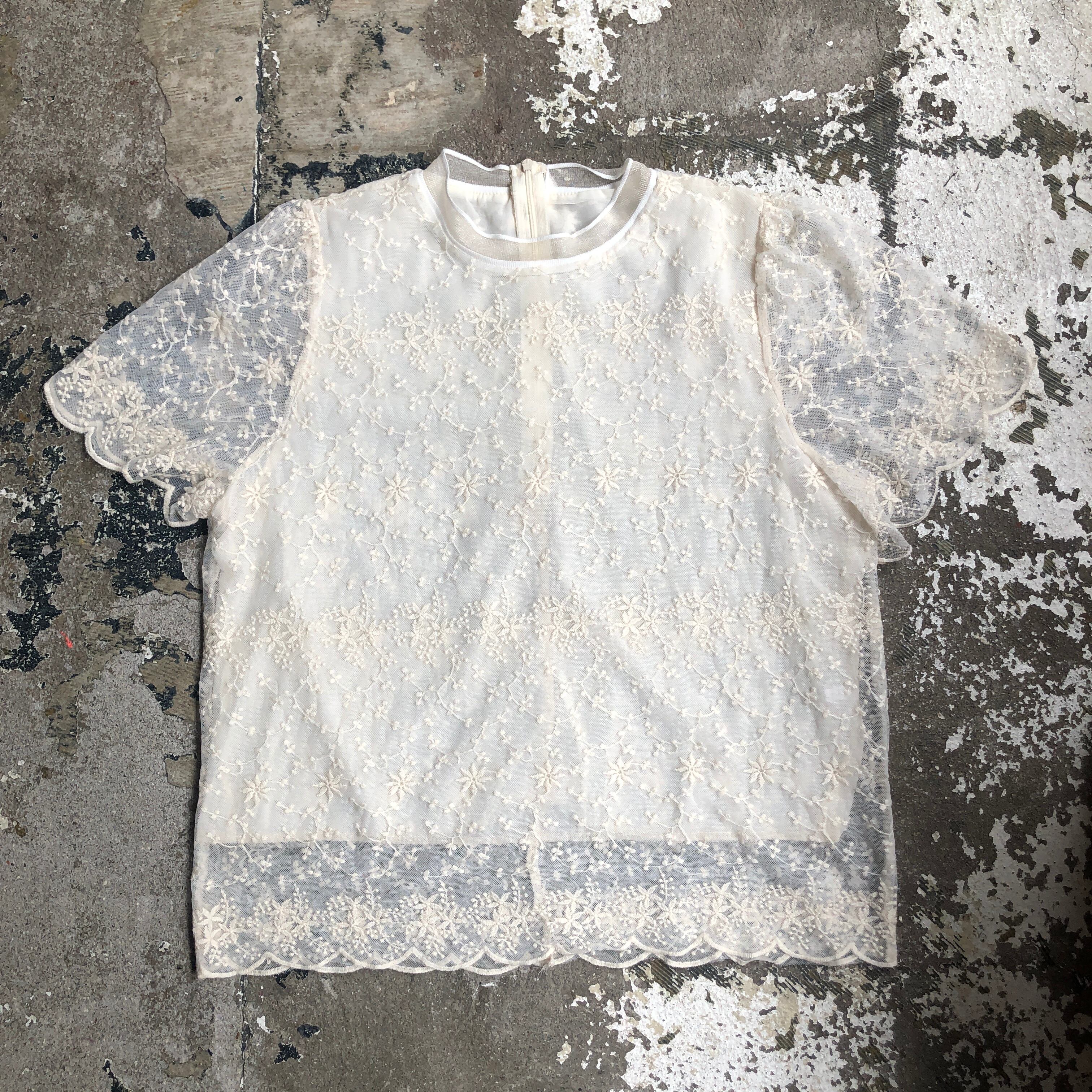 フラワー刺繍が女性らしいレーストップスです。シャイニー感のあるメッシュ地のワンカラーで上品さもプラスされております。