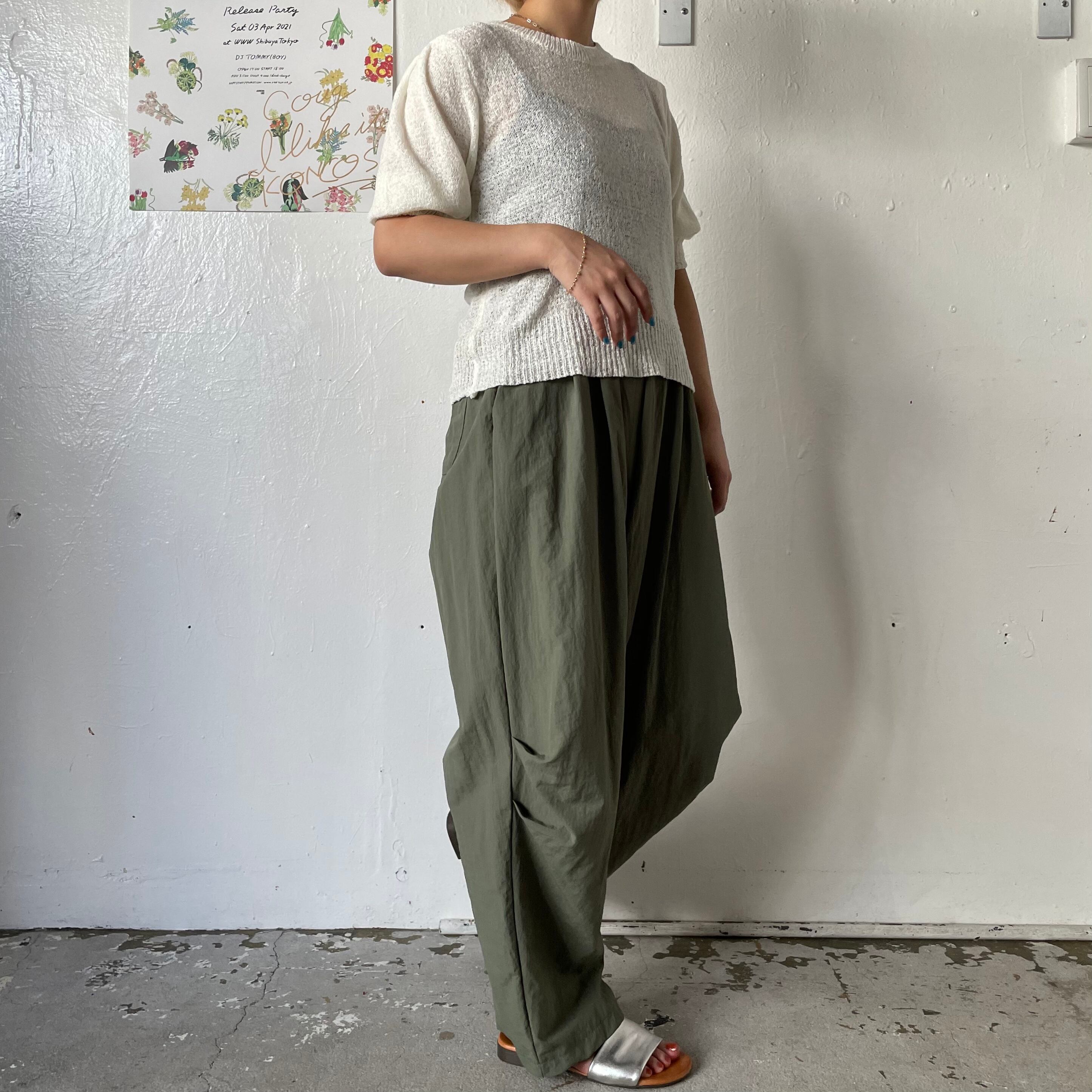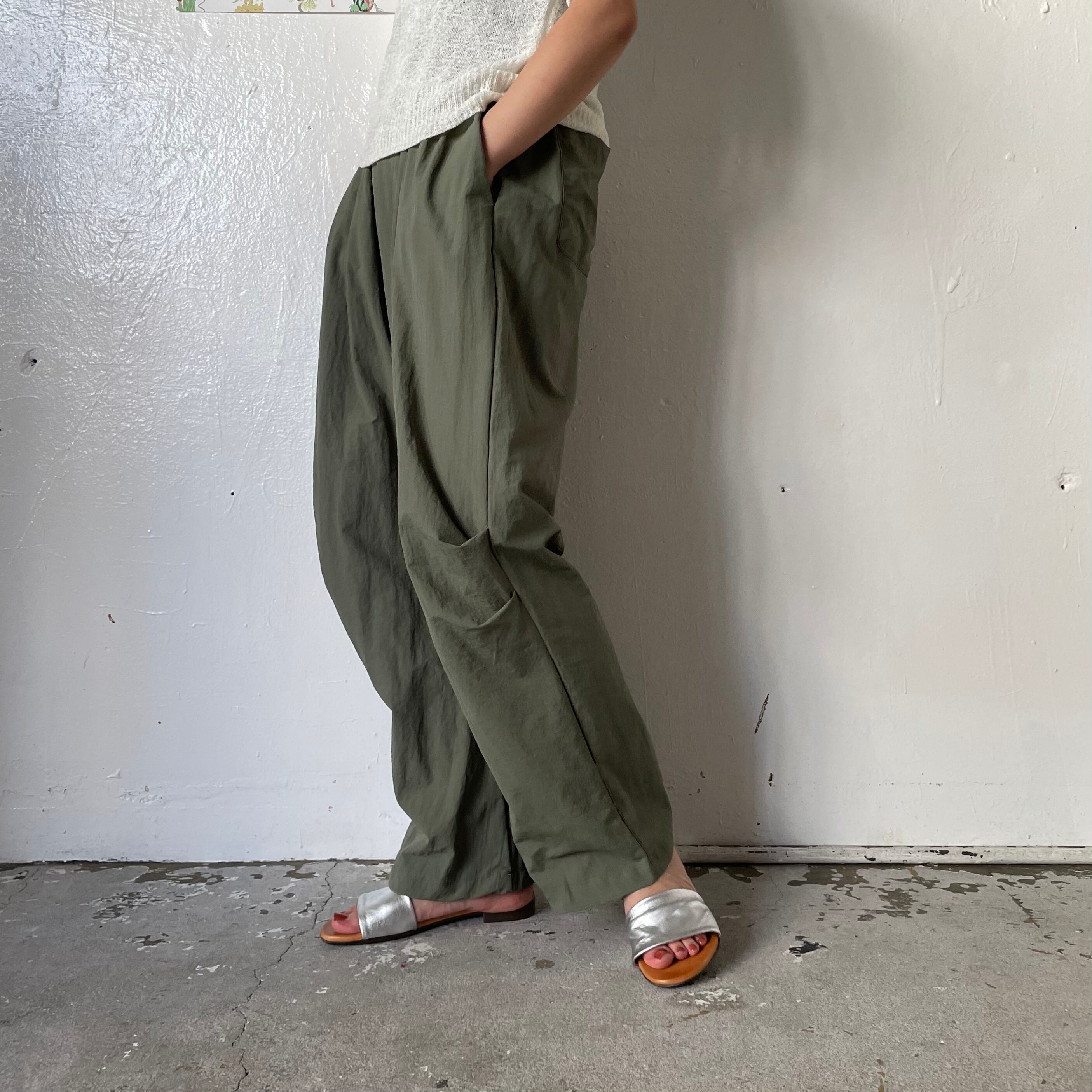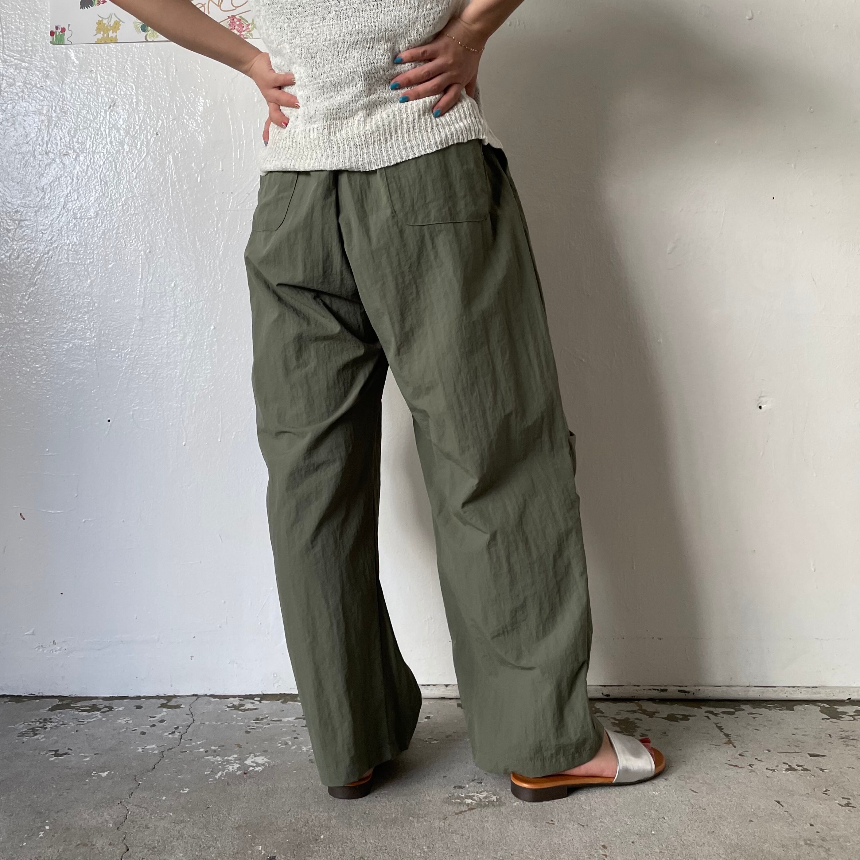 普段使いに相性の良いワークライクなデザインでシャカシャカとした生地がエッジの効いた入り枚です。膝下にタックが入り、緩みを綺麗に演出してくれます。
