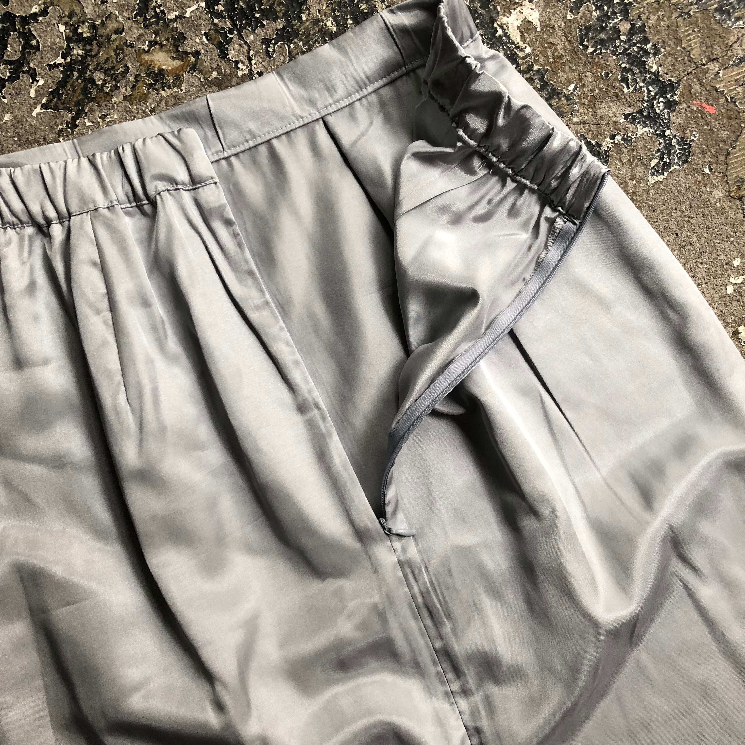 アクセントとなるシャイニーロングスカートです。後ろの裾はベントとなっており、足捌き良く着用できて、肌の露出も抑えてくれます。ゆるさのあるストレートラインとなっております。