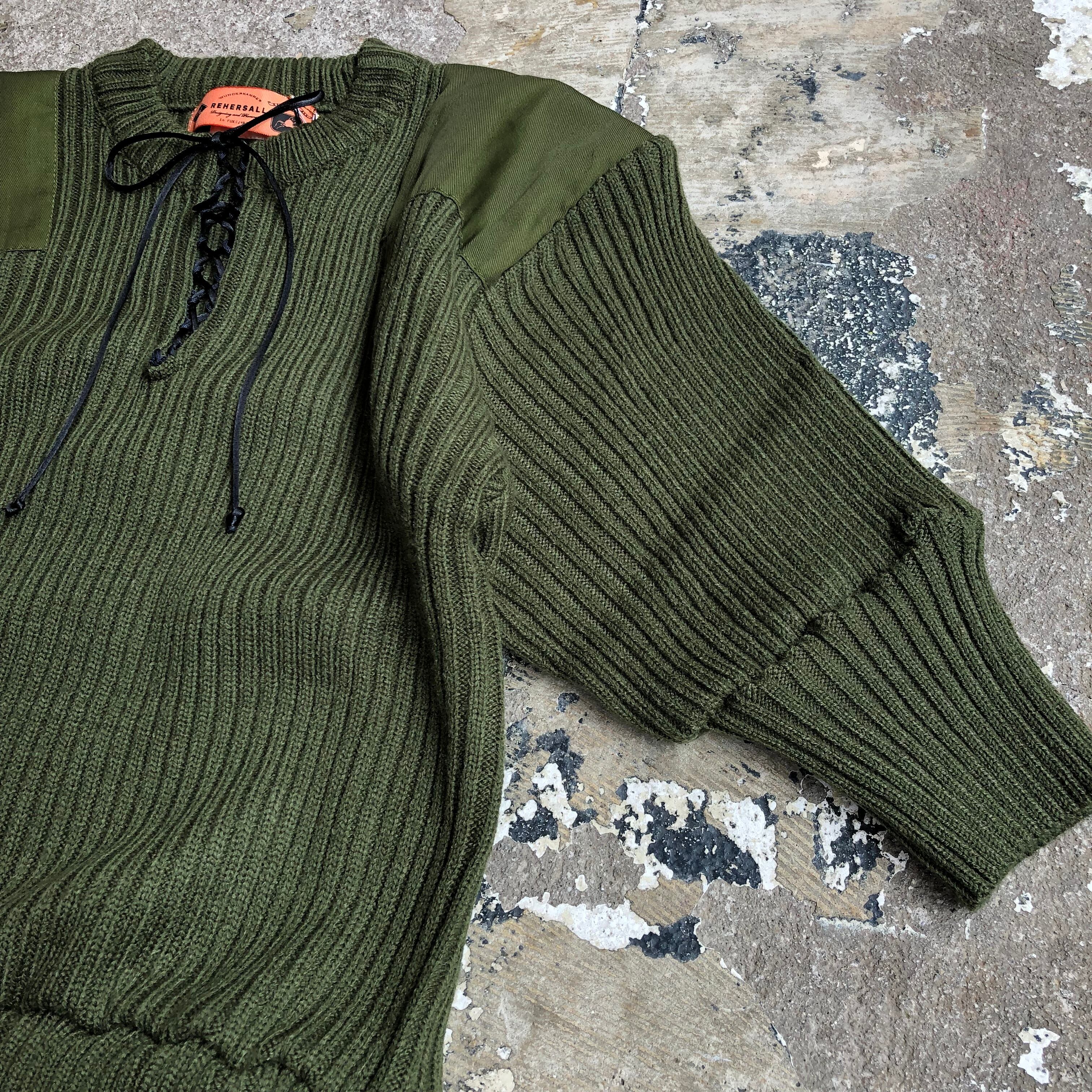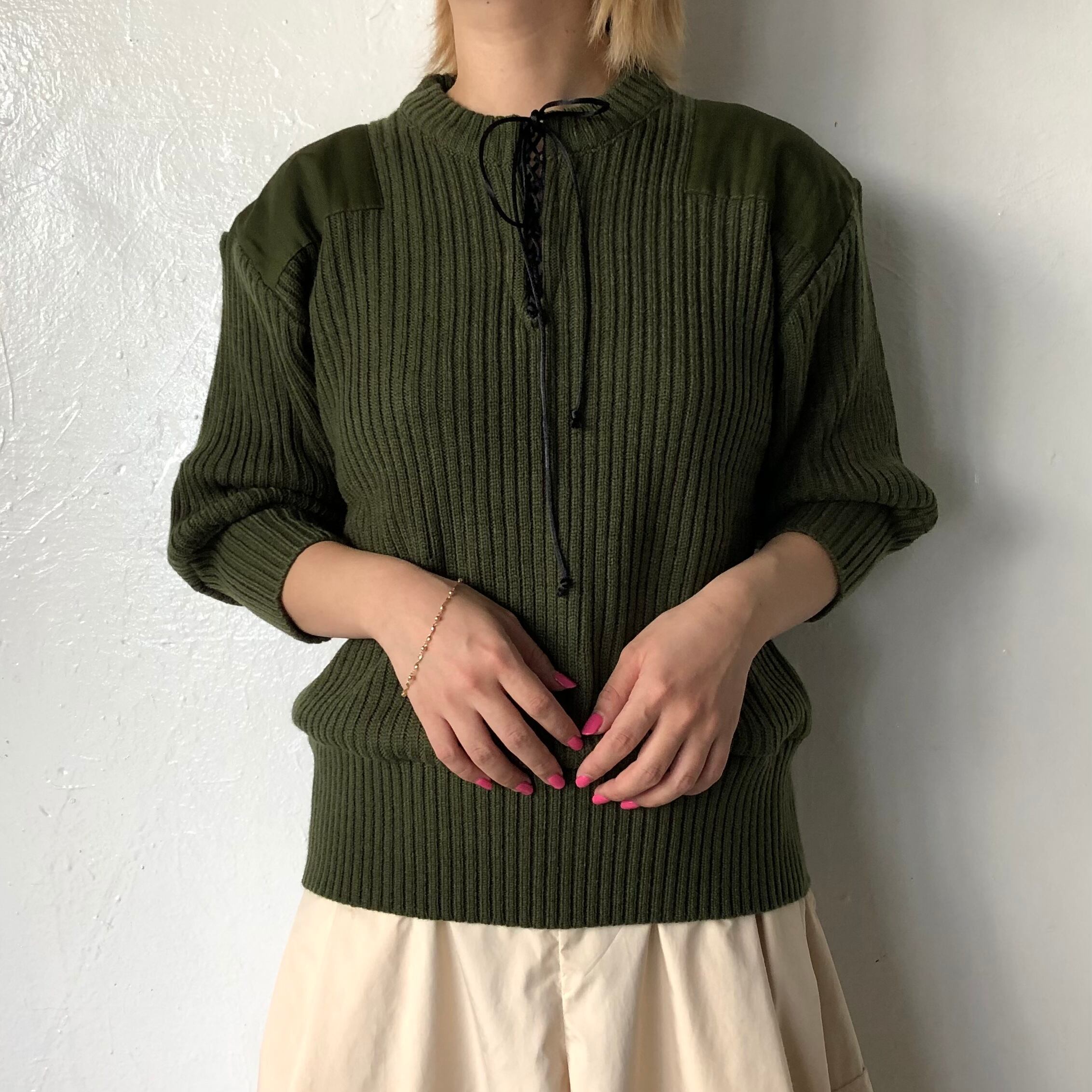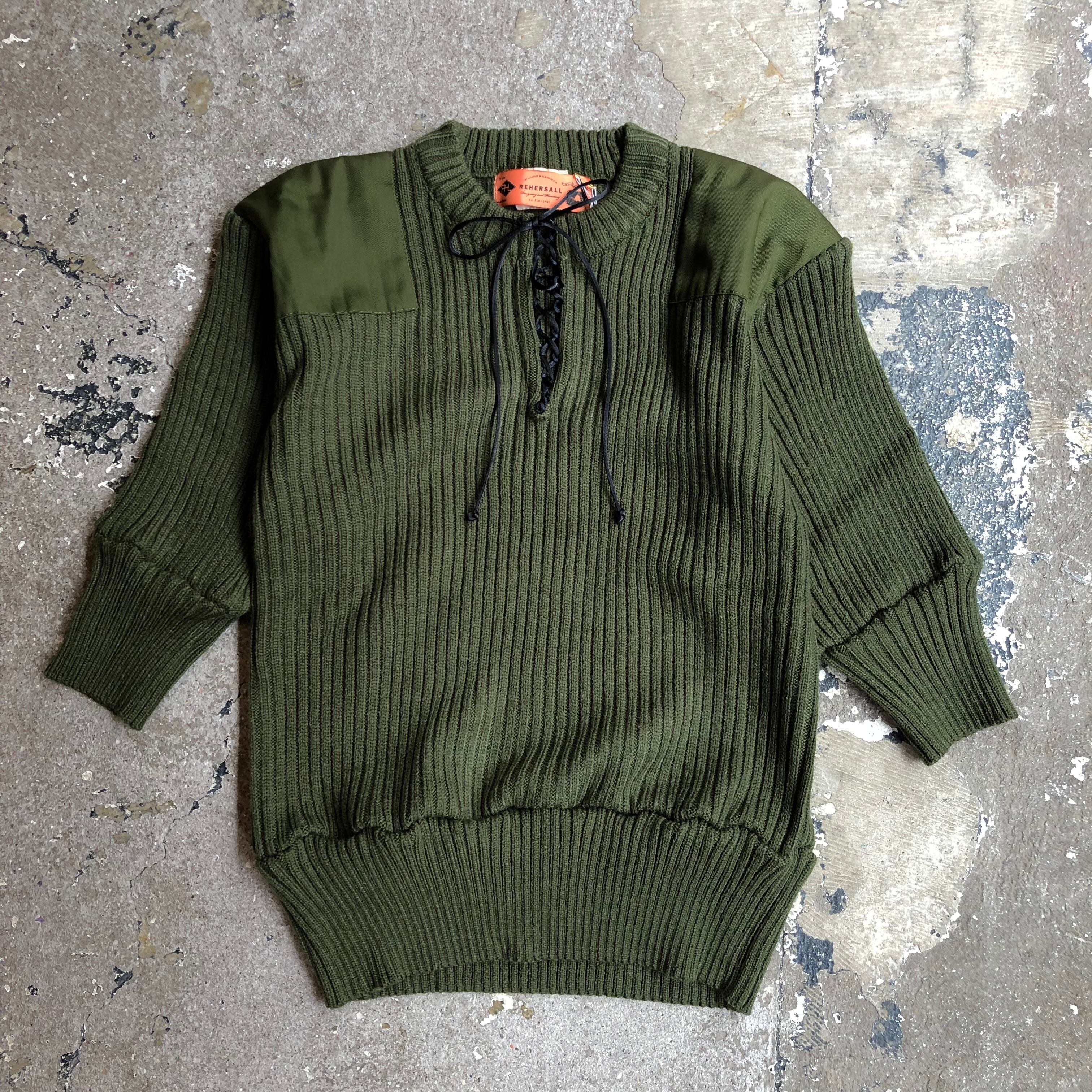USタイプのコマンドセーターをリメイクしています。肩は大きめで落ちています。パフスリーブになった袖のボリューム感がアクセントになります。衿は前だけ開いているのでかぶりやすく、レースアップでサテンのコードリボンでツヤっとリボン結びです。一見シンプルですが、おしゃれに決まる一枚です。