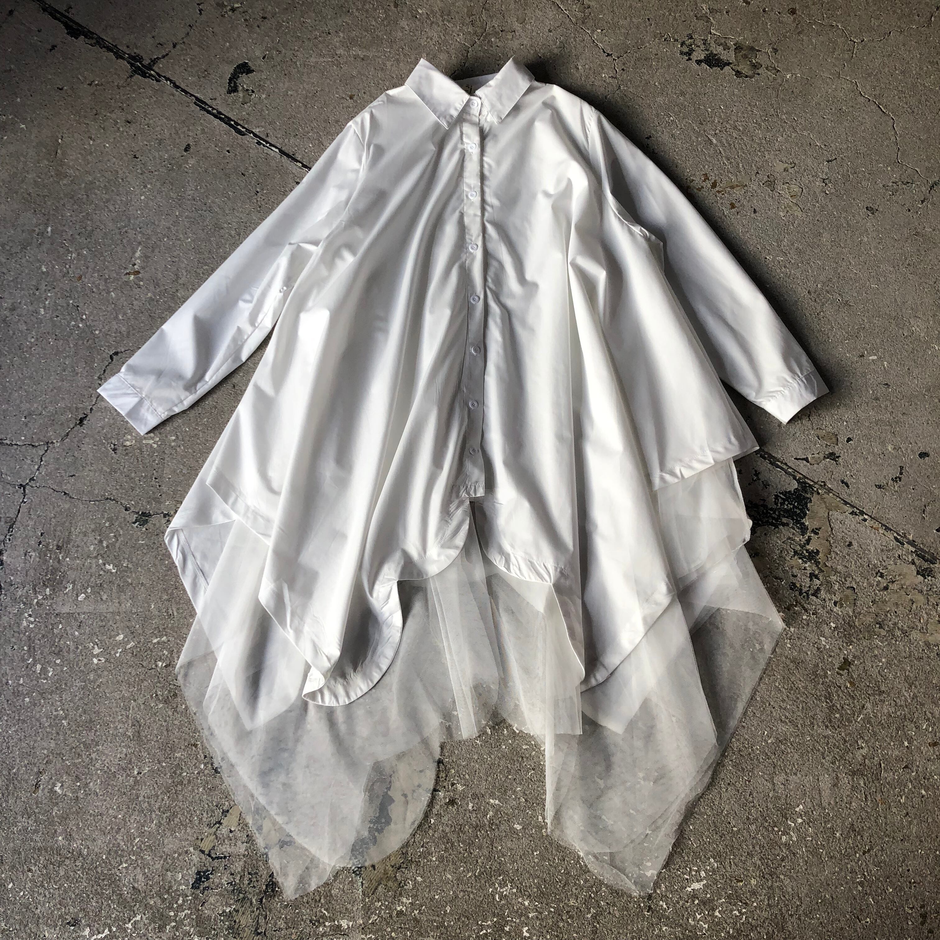 裾でサインのアクセントが個性的なロングシャツです。スカラップのようなカッティングが施されており、動きに合わせて靡くと上品な印象にもなります。ニットトップスのインナーとしてもおすすめの一枚です。