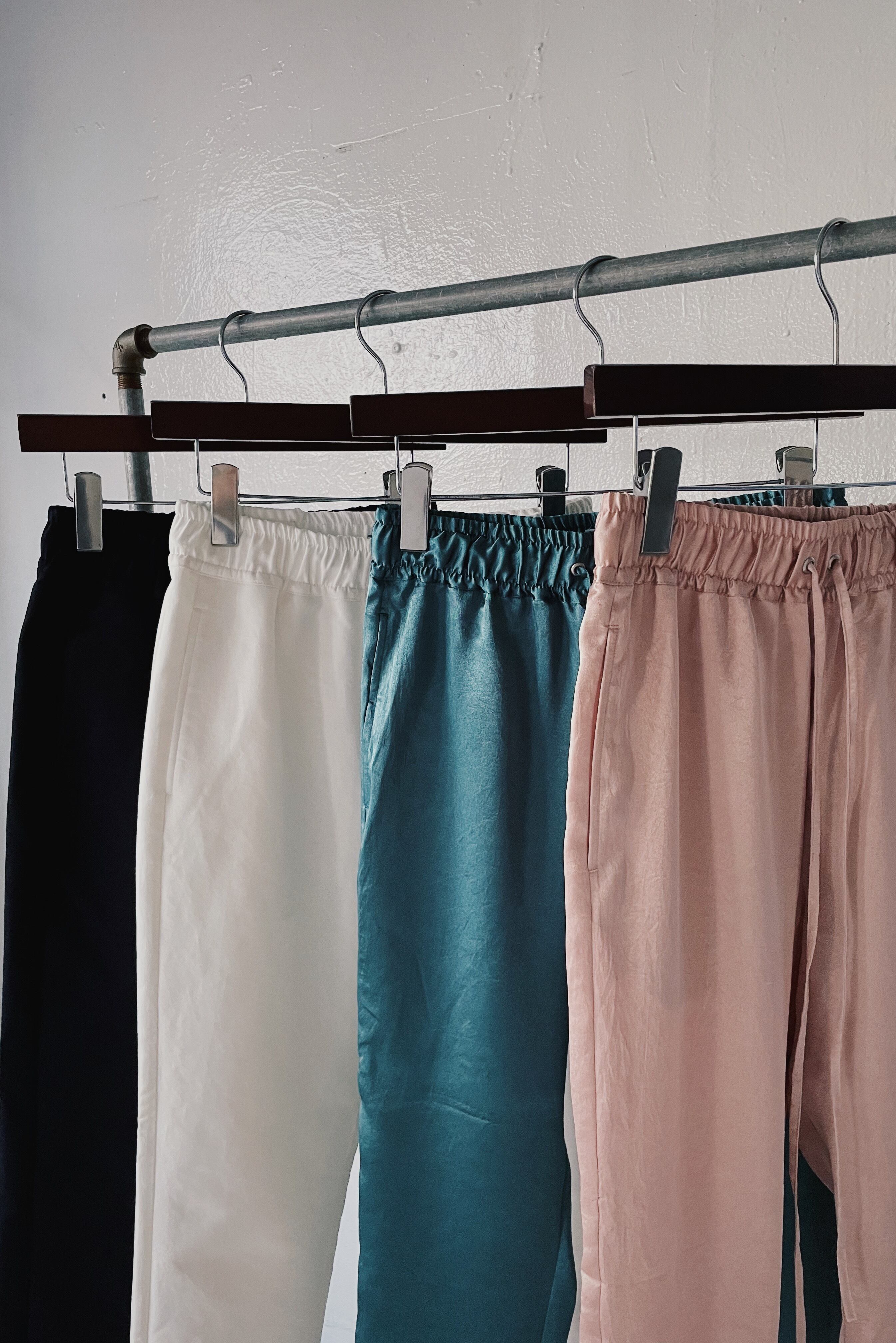 生地は、艶やかで発色の良いサテンを採用し、季節問わずサラッと気軽に履けるボトムスを目指しました。