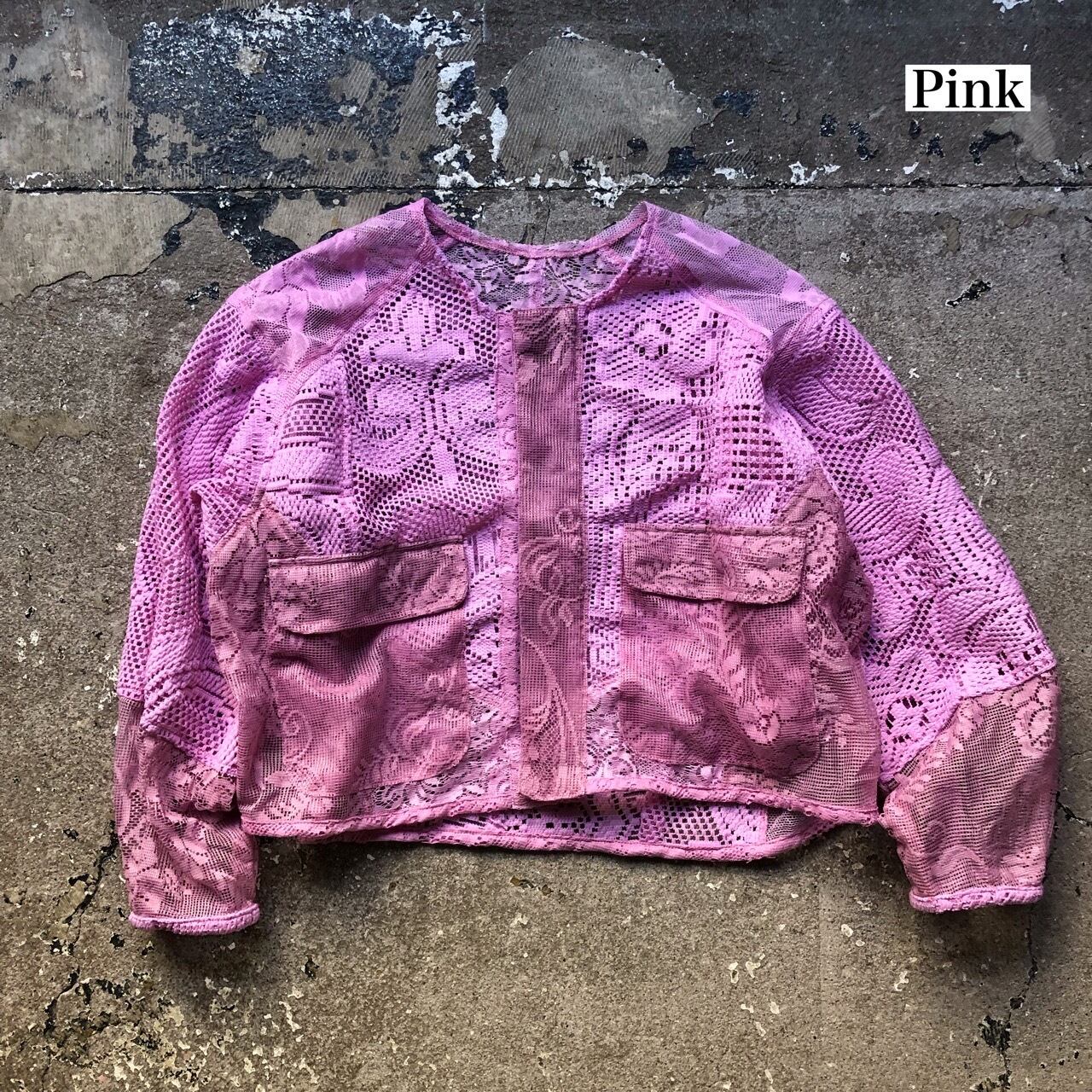 Usedのレースウエアを解体して再構築を施したレイヤードジャケットです。たっぷりと身幅を設けておりますのでスウェットやニットの上からも着用いただけます。レース生地なのでシーズンレスで楽しめる一枚です。シンプルなコーディネートにこそ映えるアイテムとして仕上がりました。全て一点ものの配色となります。