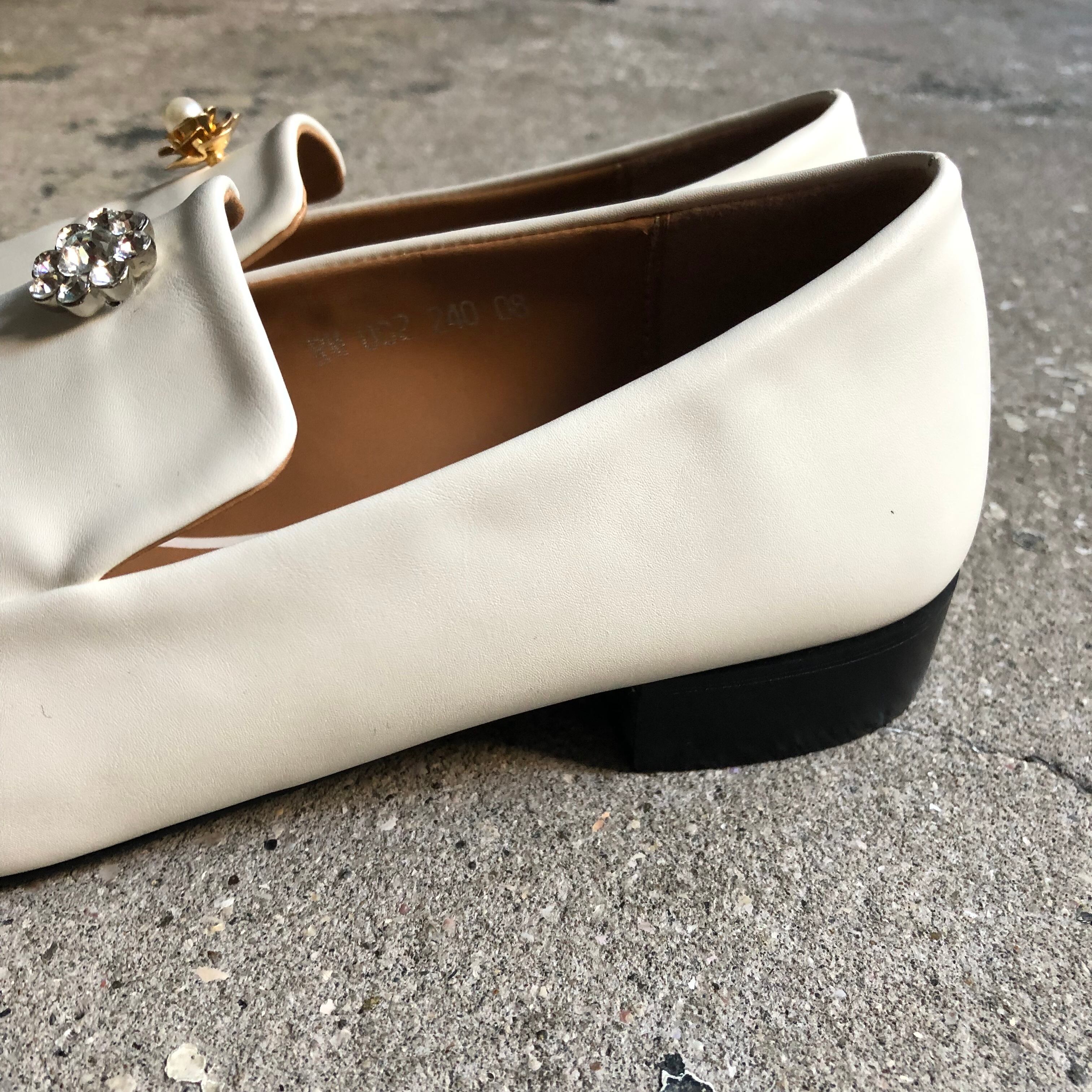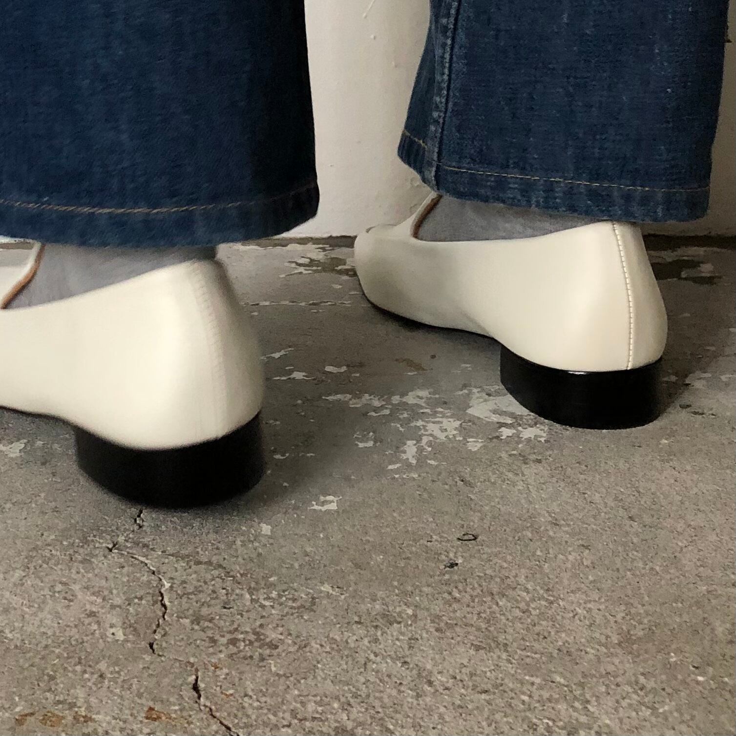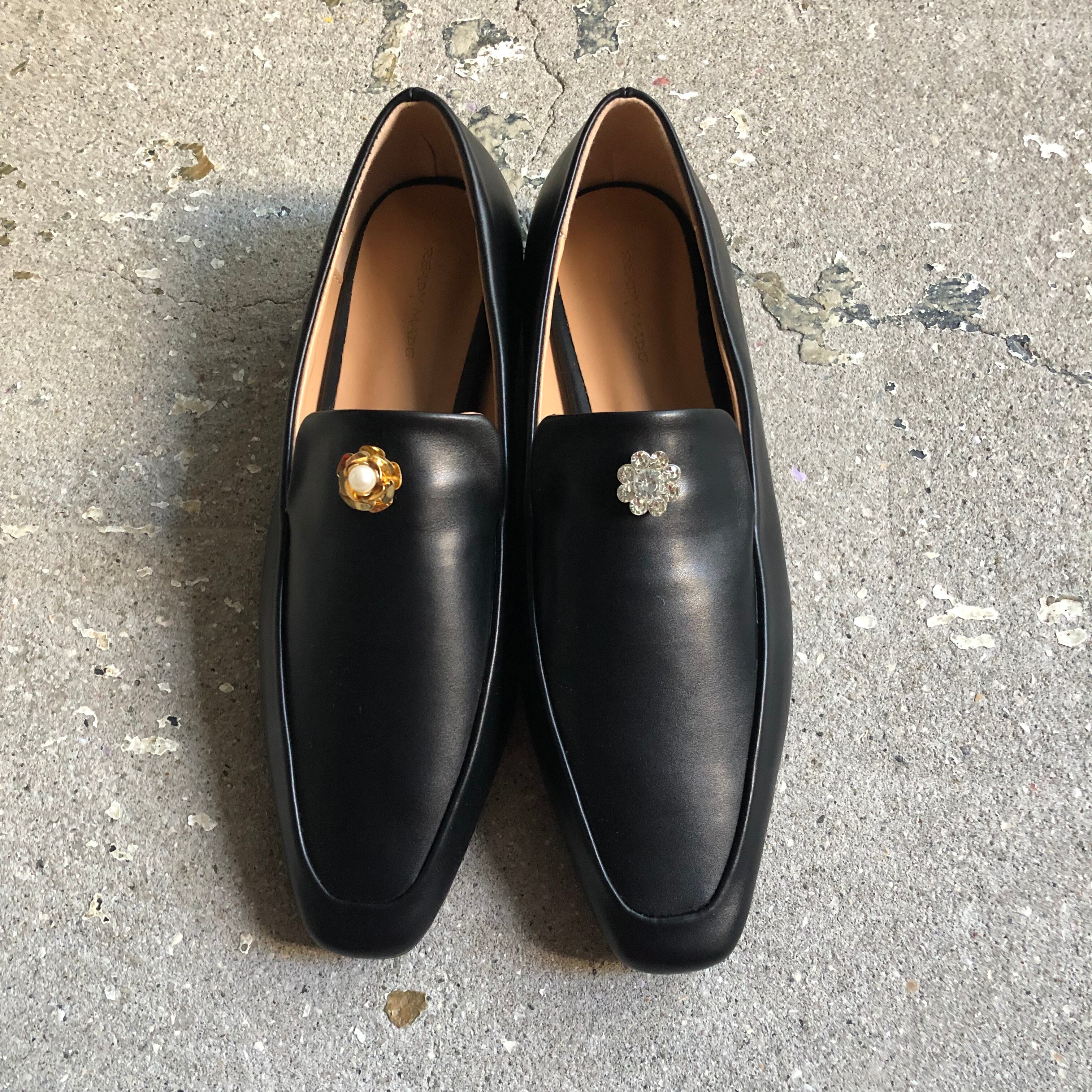 左右違ったストーンがついたレトロな印象のローファーです。普段使いはもちろん、パーティーシーンでも活躍する一足です。