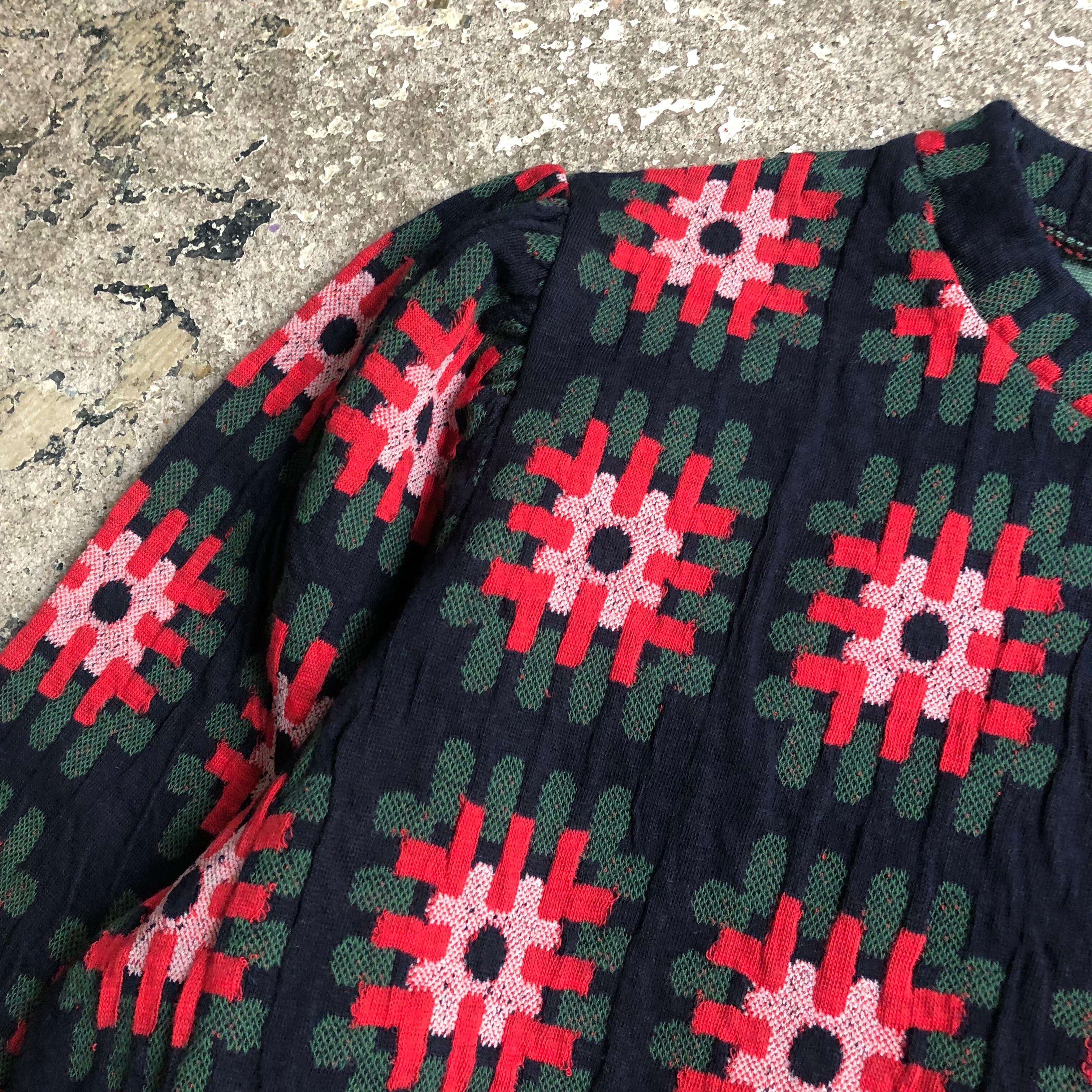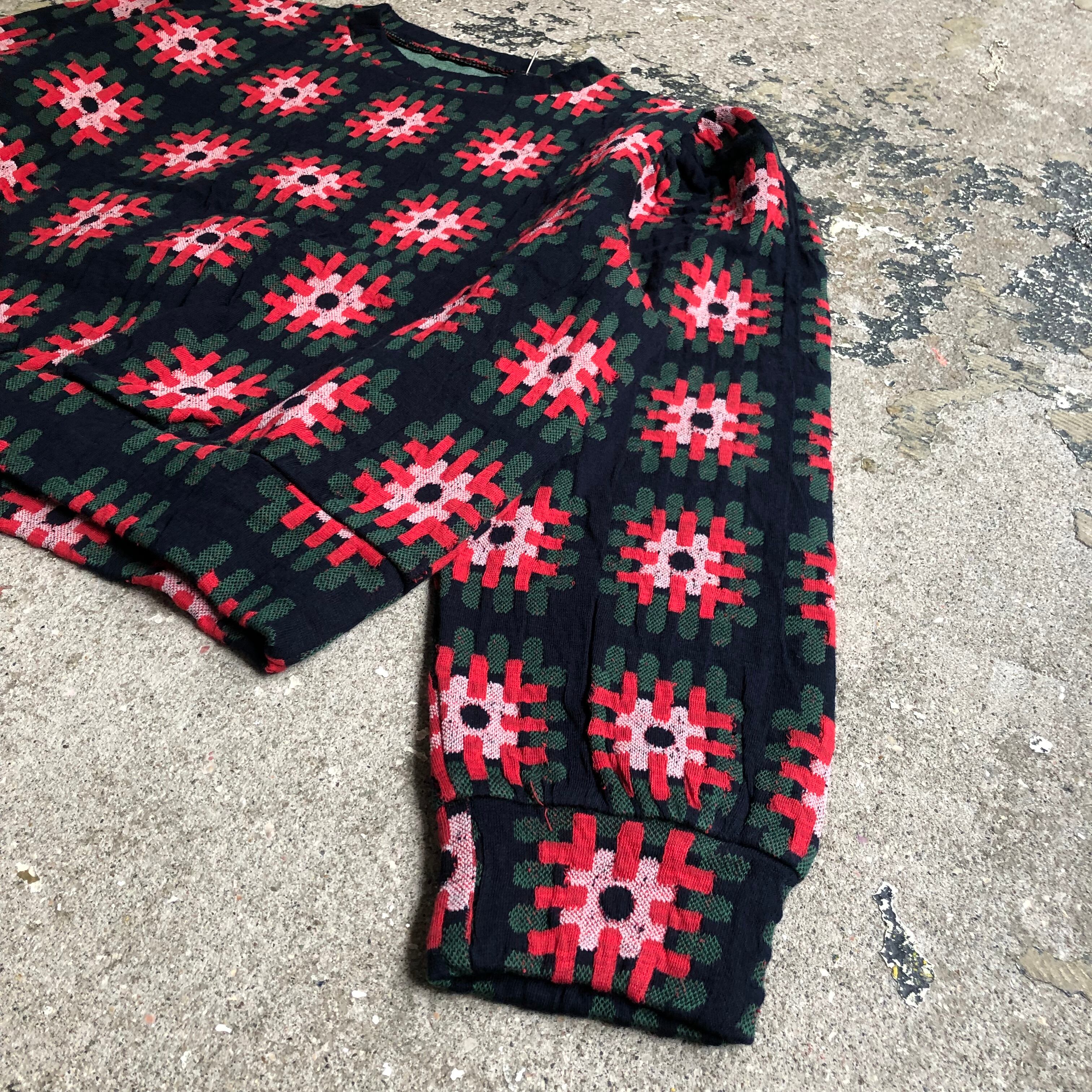 ニットパッチワークのような織りのスウェットトップスです。ショート丈でパンツインする必要がなく、ワイドなボトムと相性良く着用いただけます。
