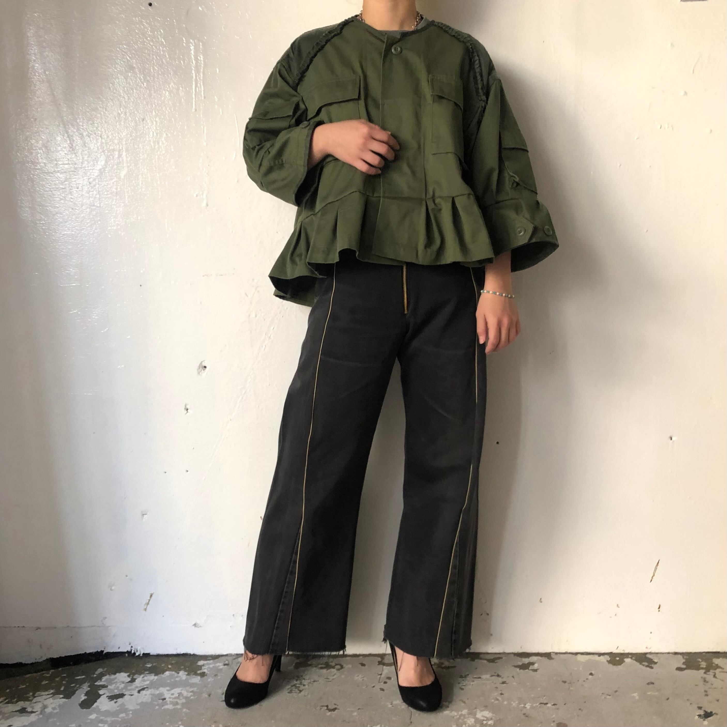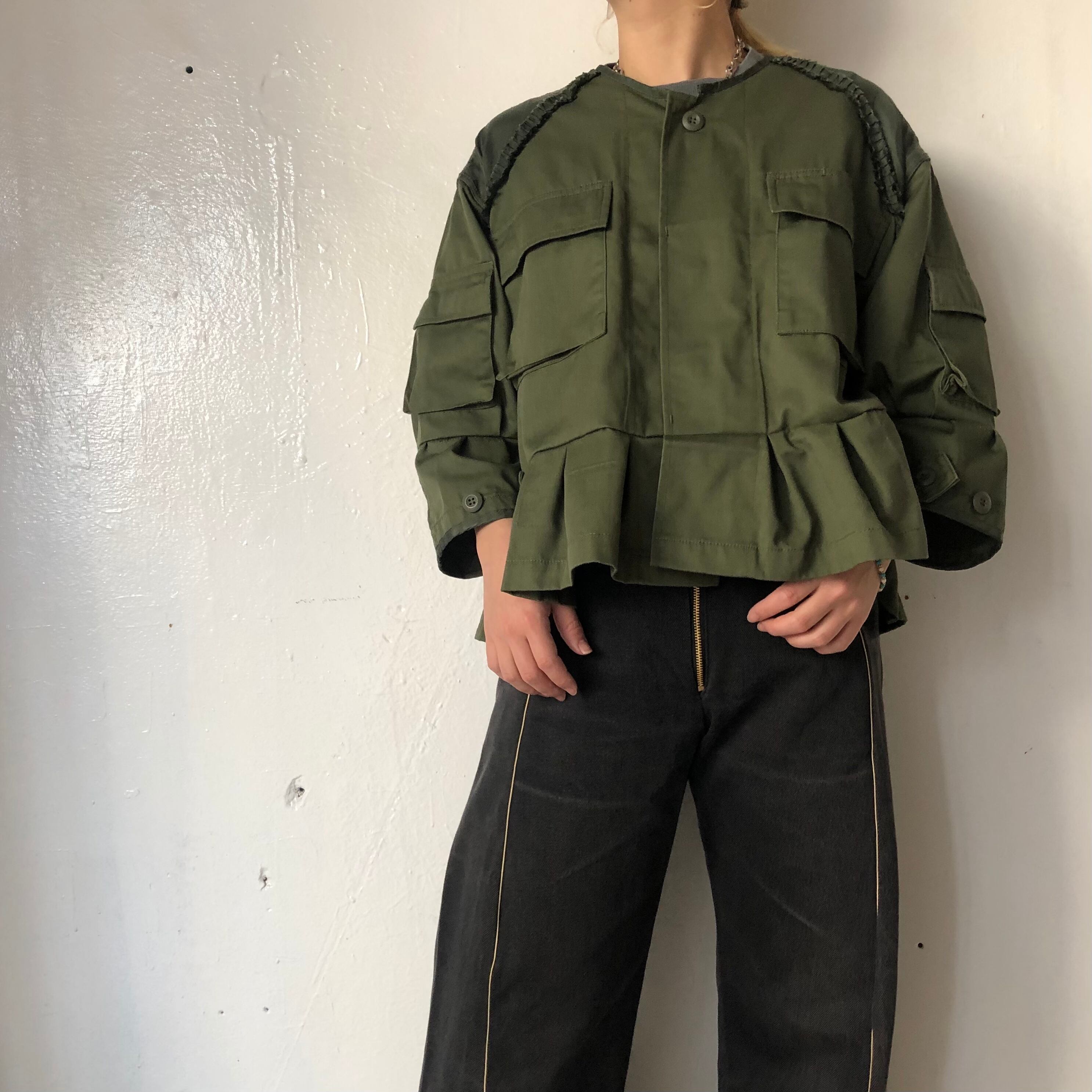 USタイプの軍物、BDU(バトルドレスユニフォーム)ジャケットをリメイクした商品です。裾と袖口がタックで甘すぎないフリルです。肩ヨークはキュプラで柔らかく、馴染みやすいドロップショルダーです。ラウンドした袖でややAラインのシルエットです。ワンピースやプリーツスカートにも相性よく着用いただけます。世の中にあるものからリメイクするサスティナビリティ商品です。