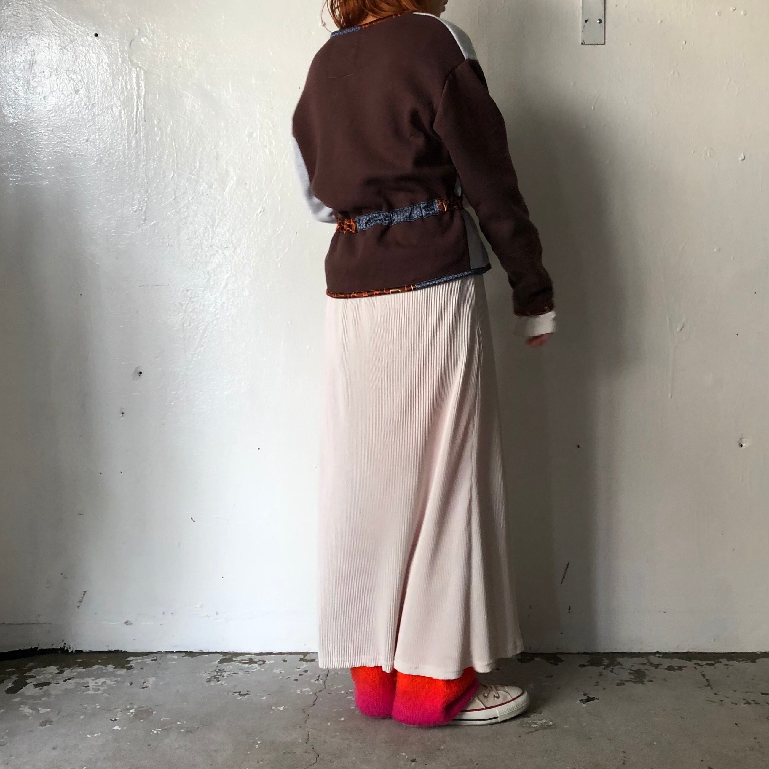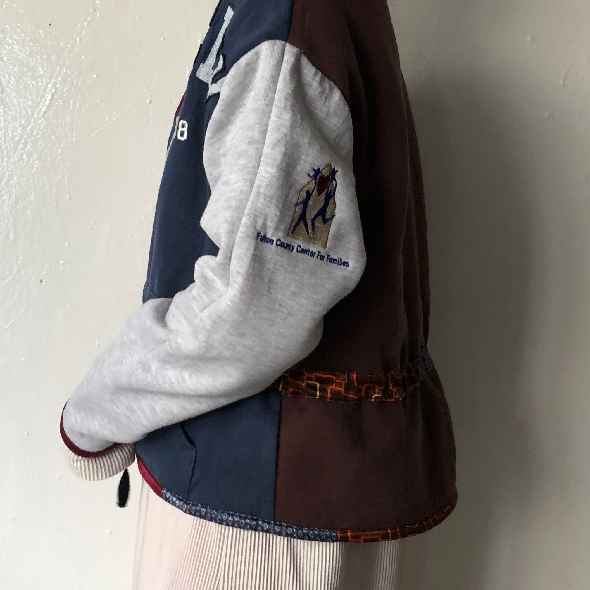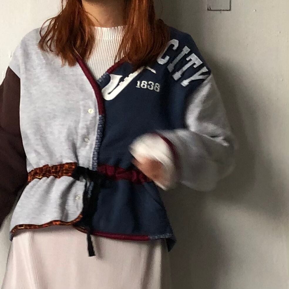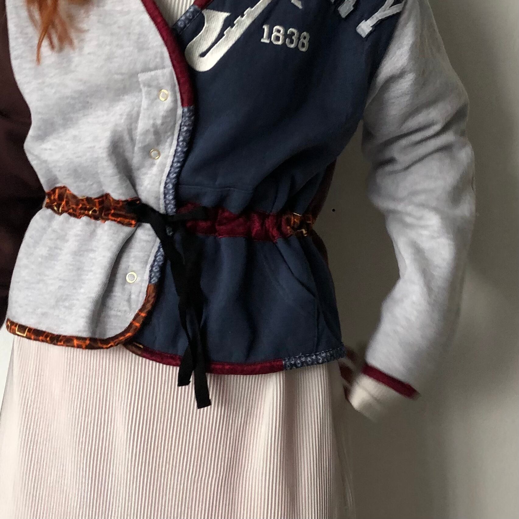 古着のパーカーをパターンでカットして作り上げられています。ヨーロッパのパジャマの古着を使い、周りをパイピングしていくことで一体感が生まれ、ウエストを絞るとパーカーのパッチワークも女性らしく仕上がります。こちらの商品は古着を仕様しております。小さな擦れや傷がありますが、味として使用されております。予めご理解くださいませ。