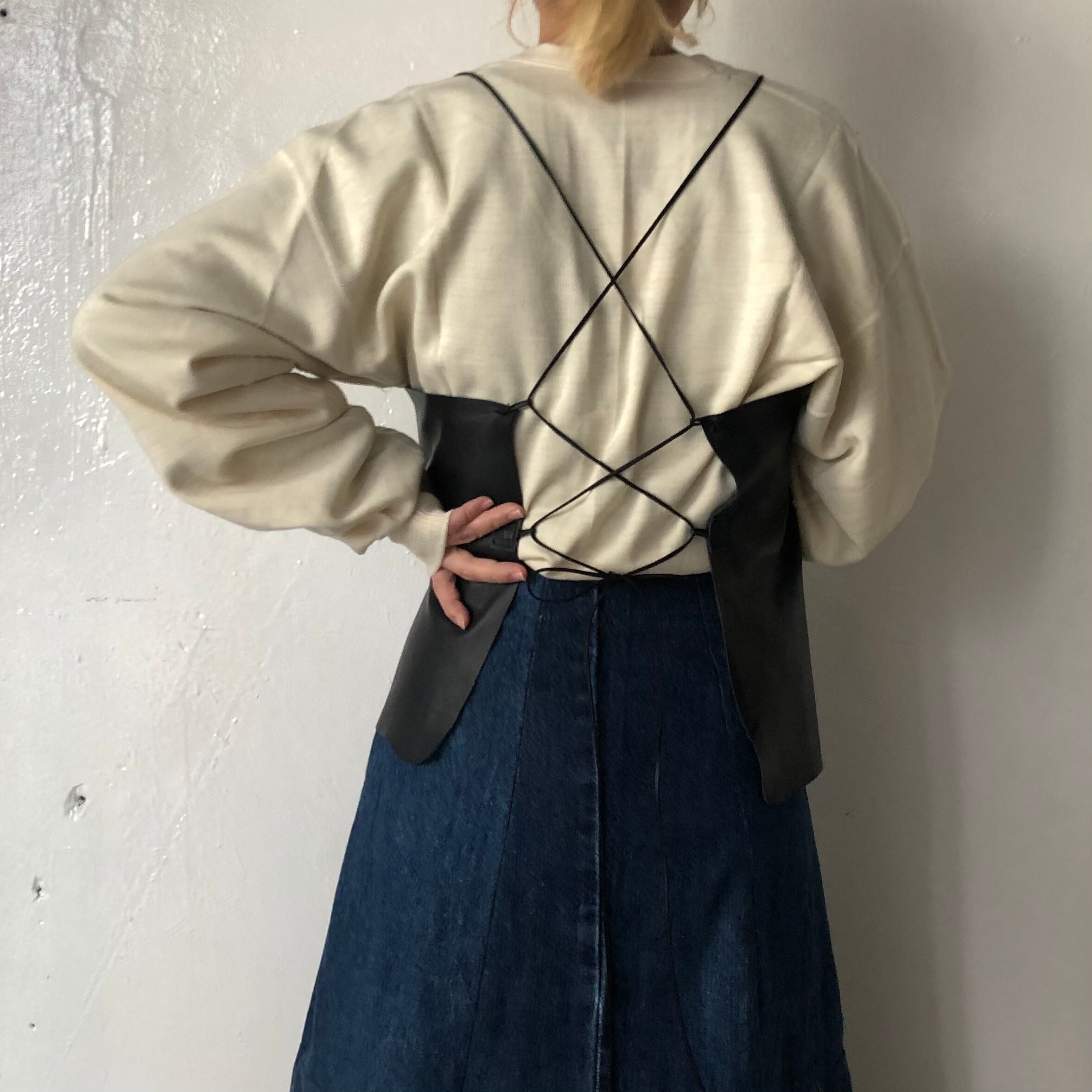 紐の長さを調整してお好きな位置で着こなせるレザーキャミソールです。紐を華奢に仕上げることでビスチェのような雰囲気にも。胸元はもちろん、腰位置で付けていただいても見栄え良く着用いただけます。不揃いな長さもデザインとしてアクセントになる一枚です。