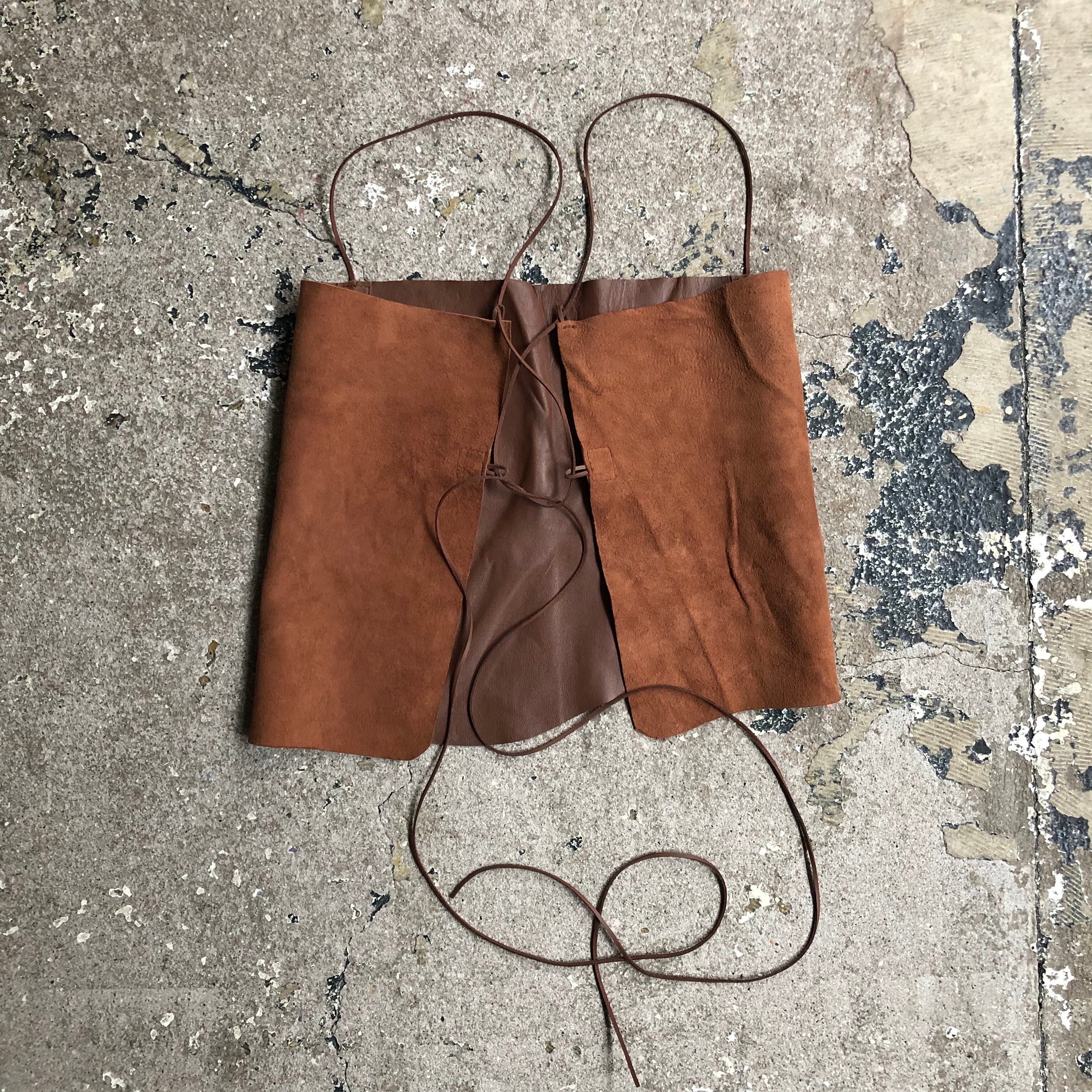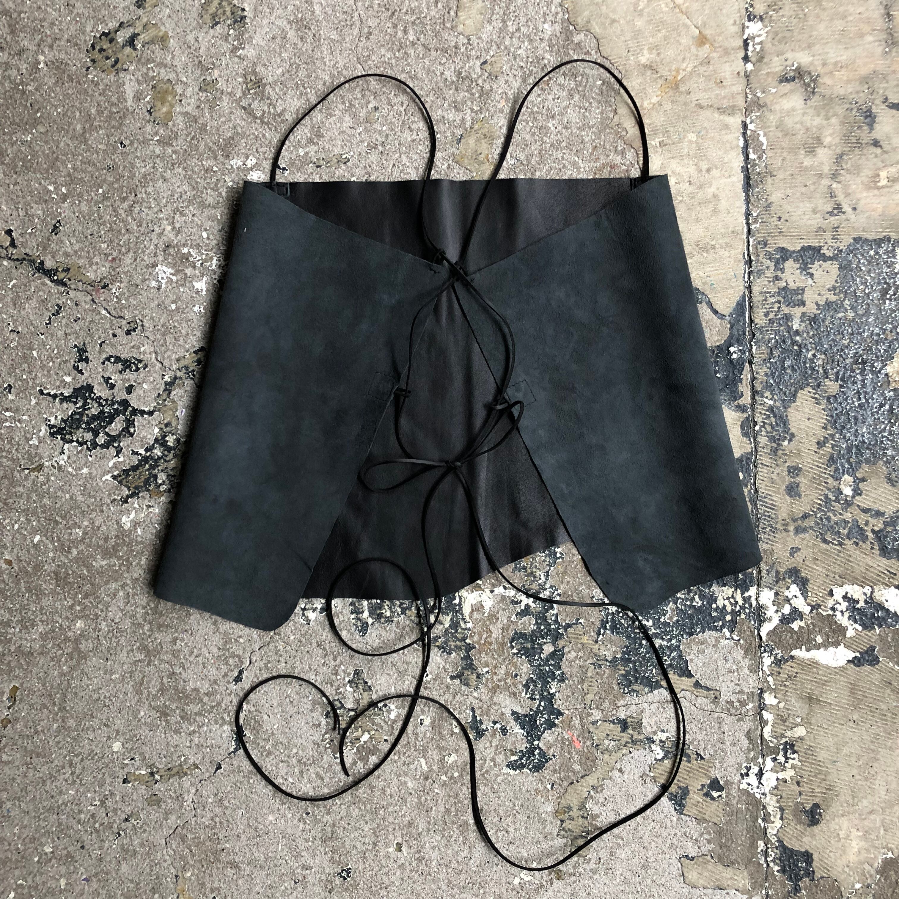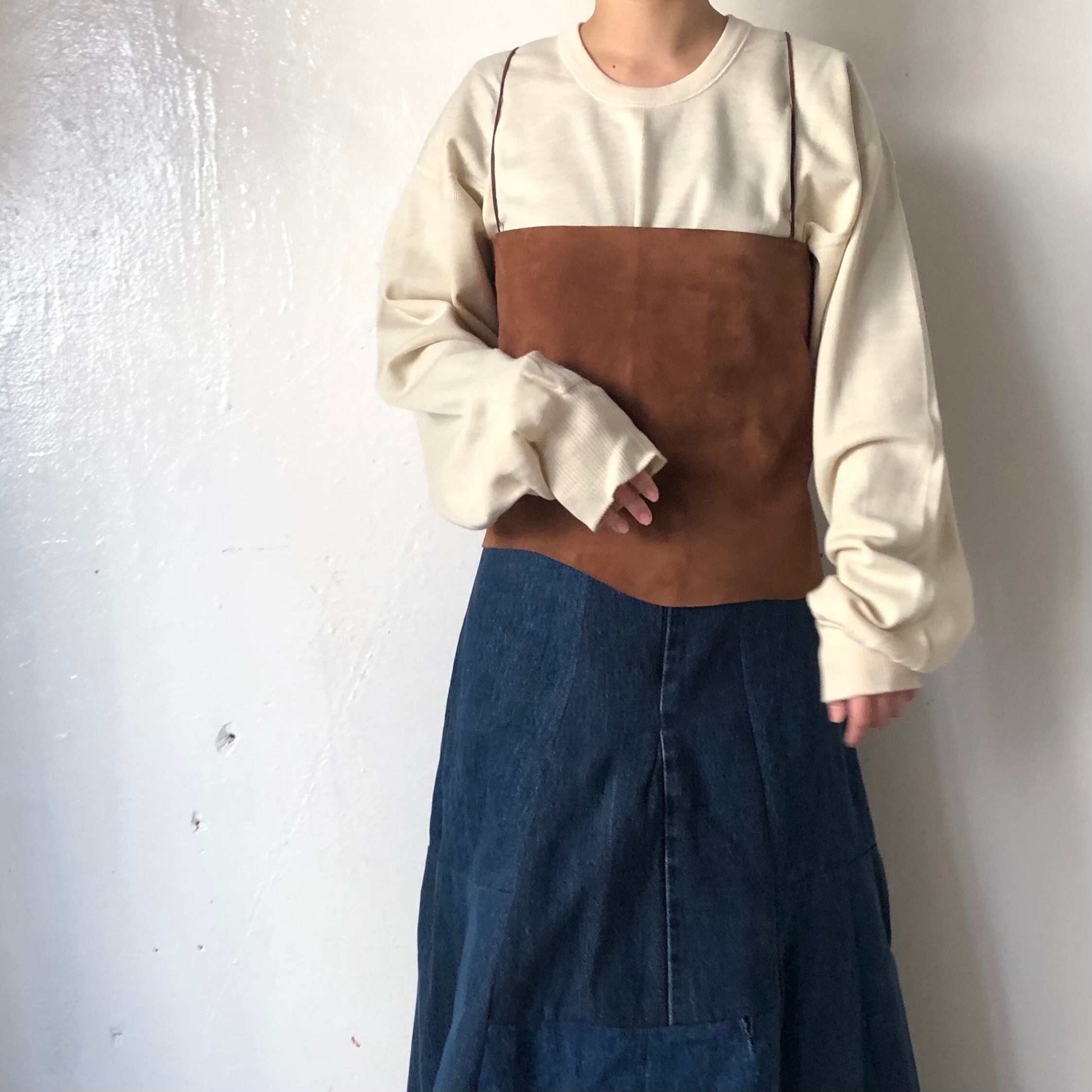 紐の長さを調整してお好きな位置で着こなせるスウェードレザーキャミソールです。紐を華奢に仕上げることでビスチェのような雰囲気にも。胸元はもちろん、腰位置で付けていただいても見栄え良く着用いただけます。不揃いな長さもデザインとしてアクセントになる一枚です。