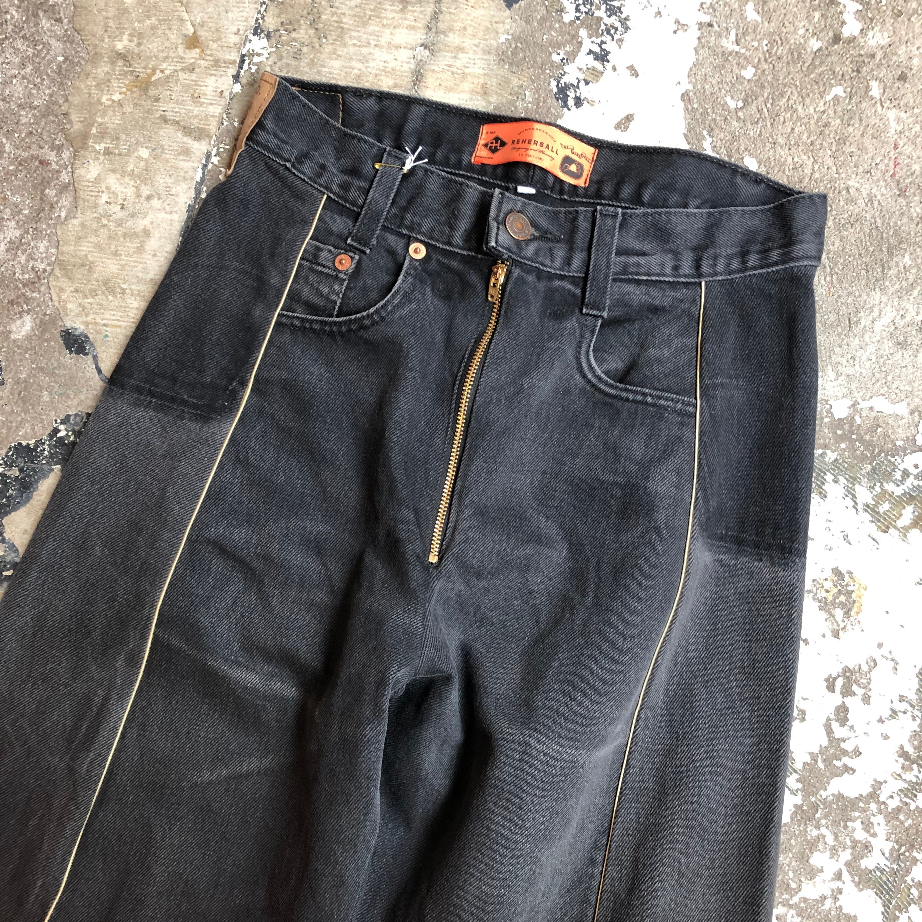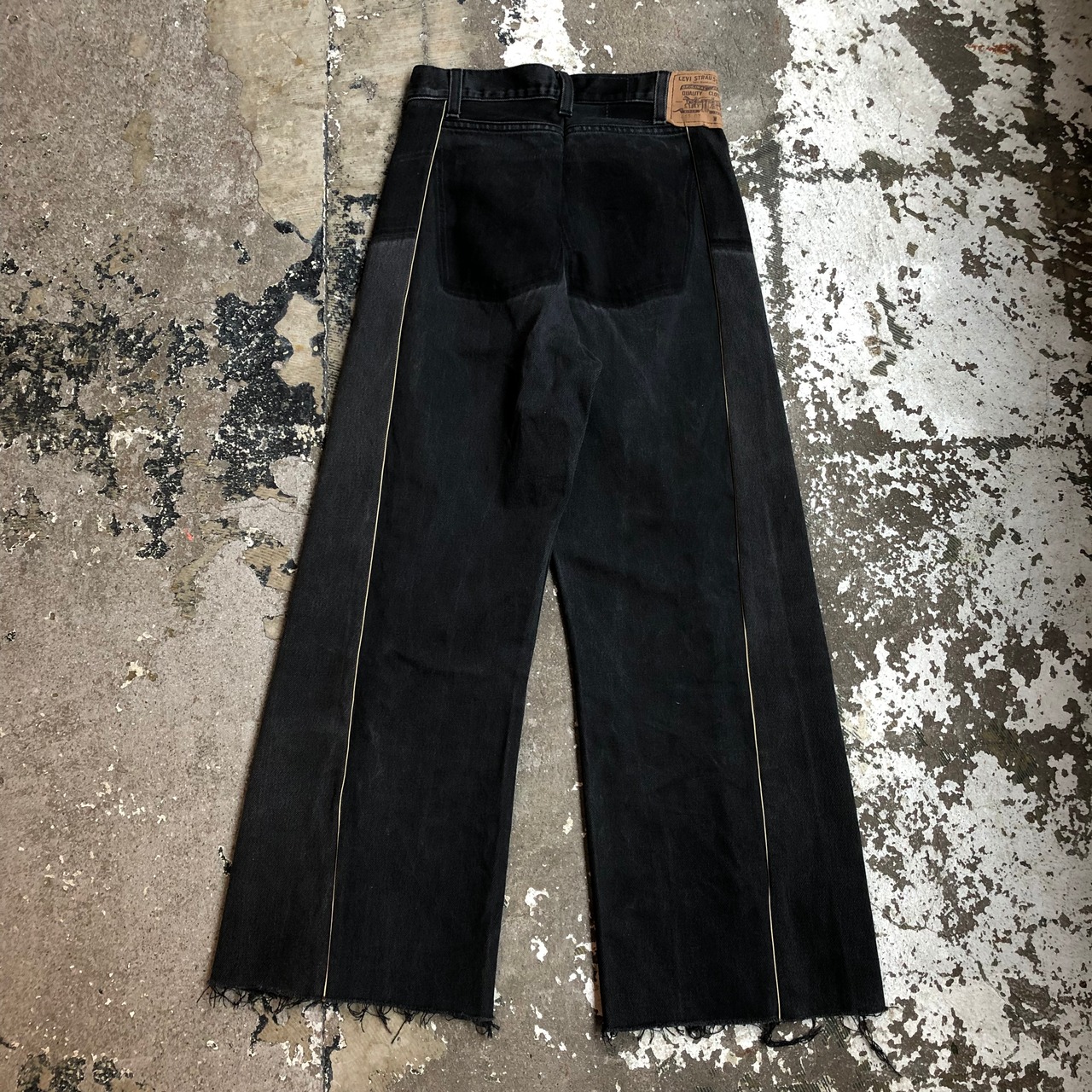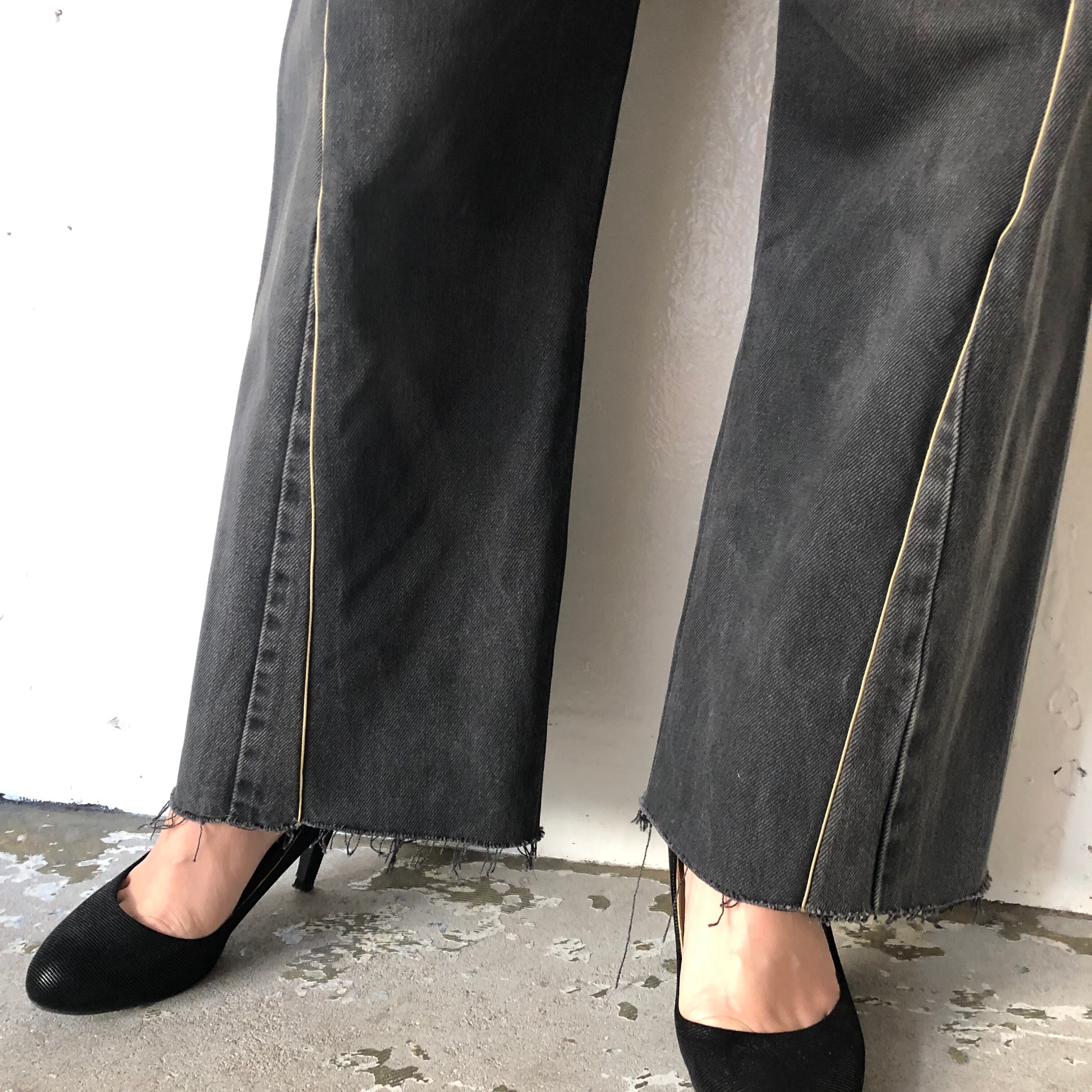 リーバイスのデニムを2本使用した新型リメイクデニムです。腰回りをすっきりとさせ、裾にかけて控えめなフレアになっており、フロントのゴールドジップとゴールドのコードラインがアクセントの一本です。こちらは古着のリメイクのため、色褪せやダメージが入っている場合もございます。予めご了承くださいませ。