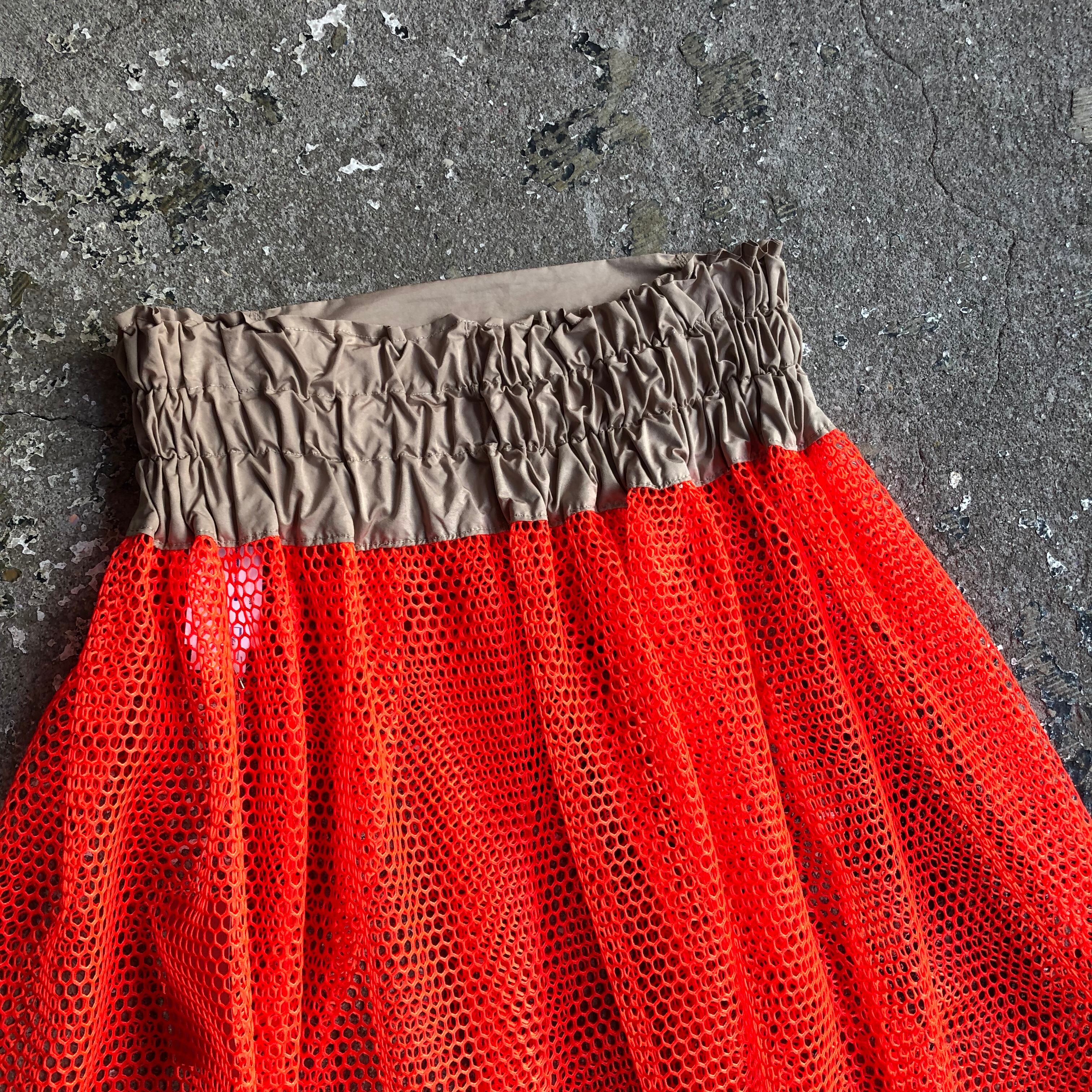 ビビットカラーアクセントで透け感を楽しむ、レイヤードスカートです。立体感の生まれるタックと大きく広がりすぎない裾周りで、丈の短いトップスに相性良く着用いただけます。ありきたりなトップスボトムスタイルにプラスすると個性的なコーディネートが楽しめます。裾はカットオフなのでお好みの着丈にカットしても◎