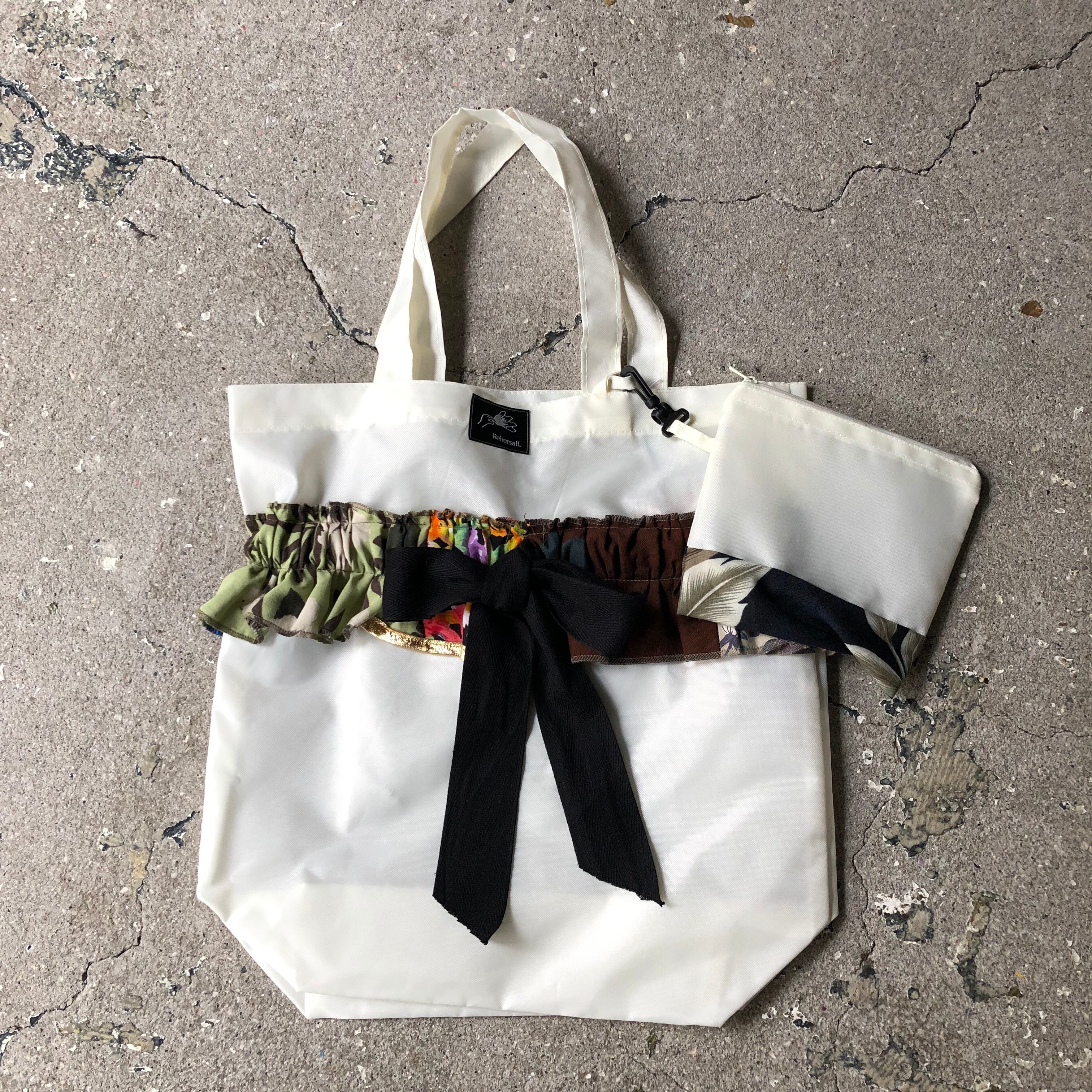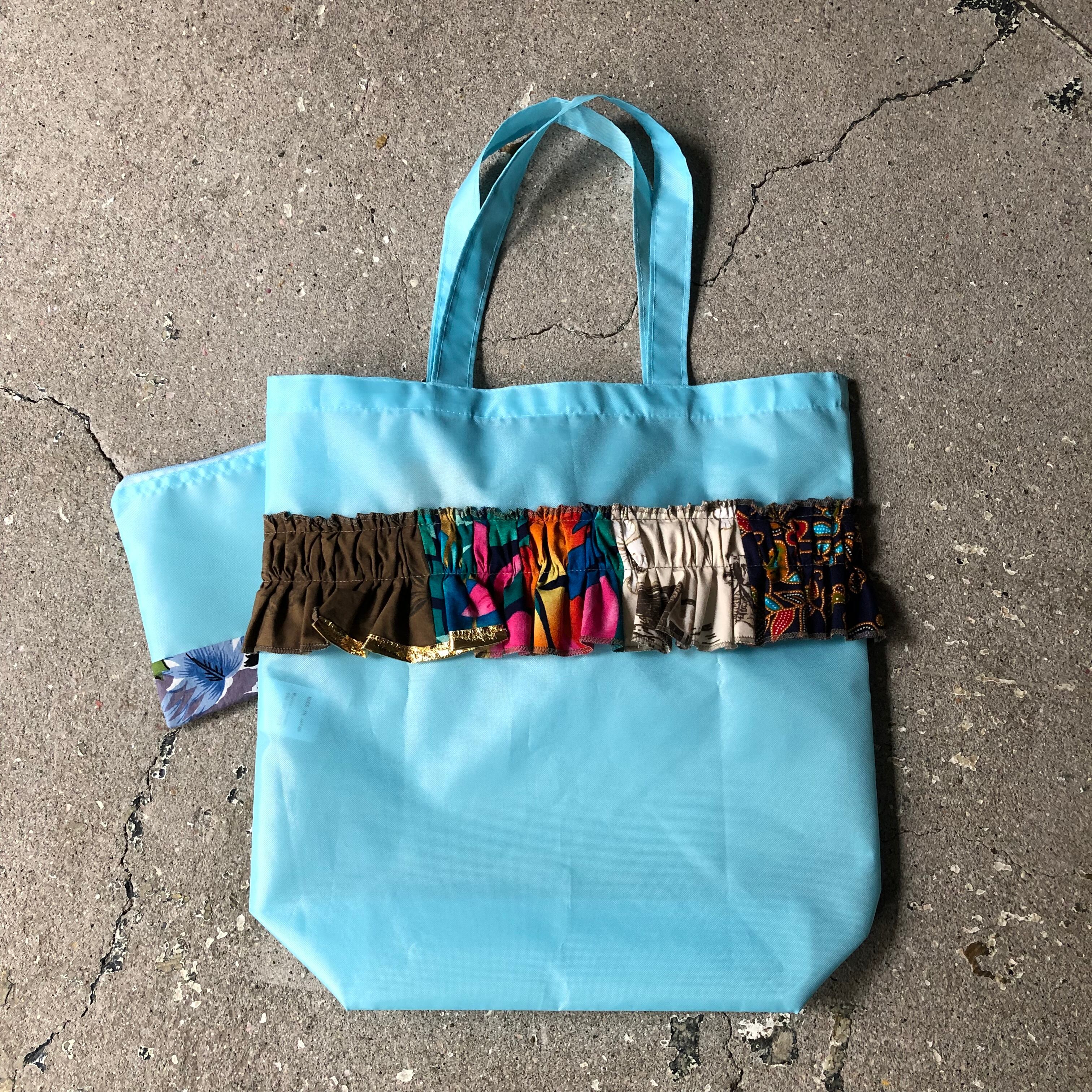 アロハシャツの端切れを使用したフリルが付いたマチ付きトートです。今回はミニポーチ付きで持ち運びが便利になりました。フリル部分は古着を使用したアソートの柄となっております。