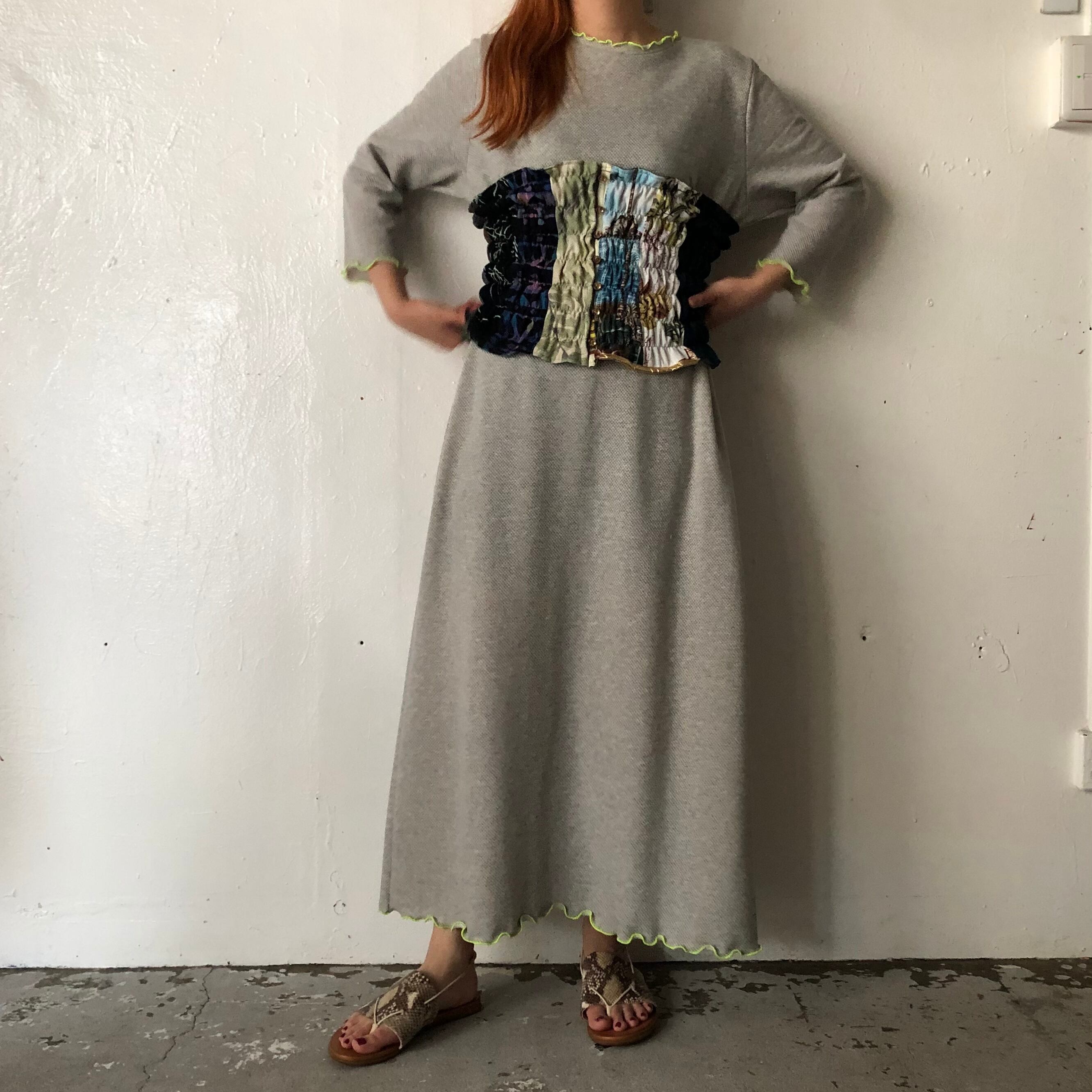 古着のアロハシャツをパッチワークし、さらにシャーリングゴムでステッチを入れたビスチェです。柔らかなゴムは窮屈感なく着用ができ、バストやウエストでマークし、装いを1ランクアップさせてくれるアイテムです。飴玉のようなビーズボタンもポーンとになっております。こちらは古着を使用しております。擦れや傷等も味としてお楽しみください。アソート商品のため同じお柄はなく、一点ものとしてご愛用いただけます。