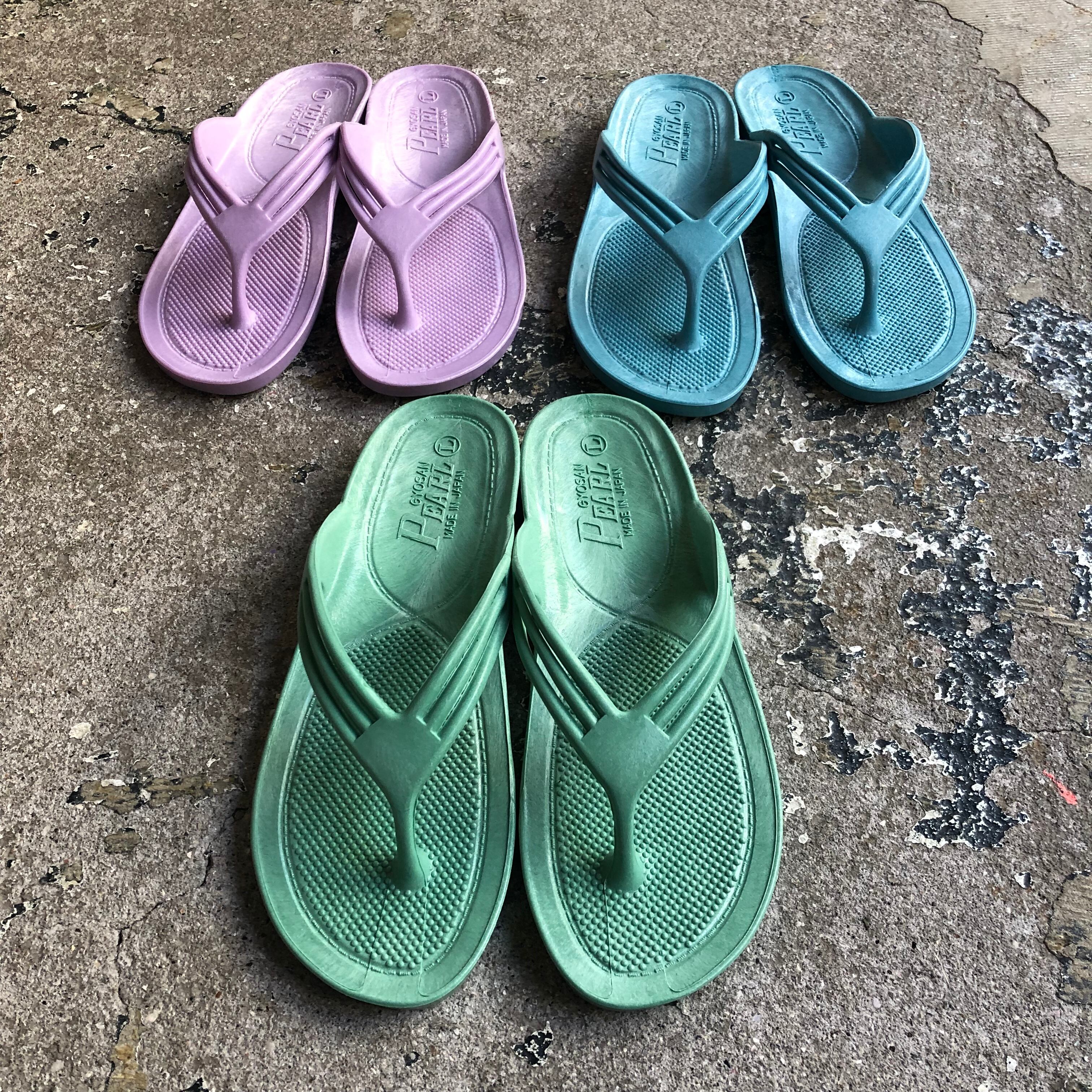 もともと古くから小笠原の地元漁師の間で「滑らないサンダル」として愛用されていたもので、鼻緒とソールが一体成型になっていてとても頑丈なビーチサンダルです。主に漁業を営んでいる人が好んで履いていることから、『漁業従事者用のサンダル』、略して『ギョサン』