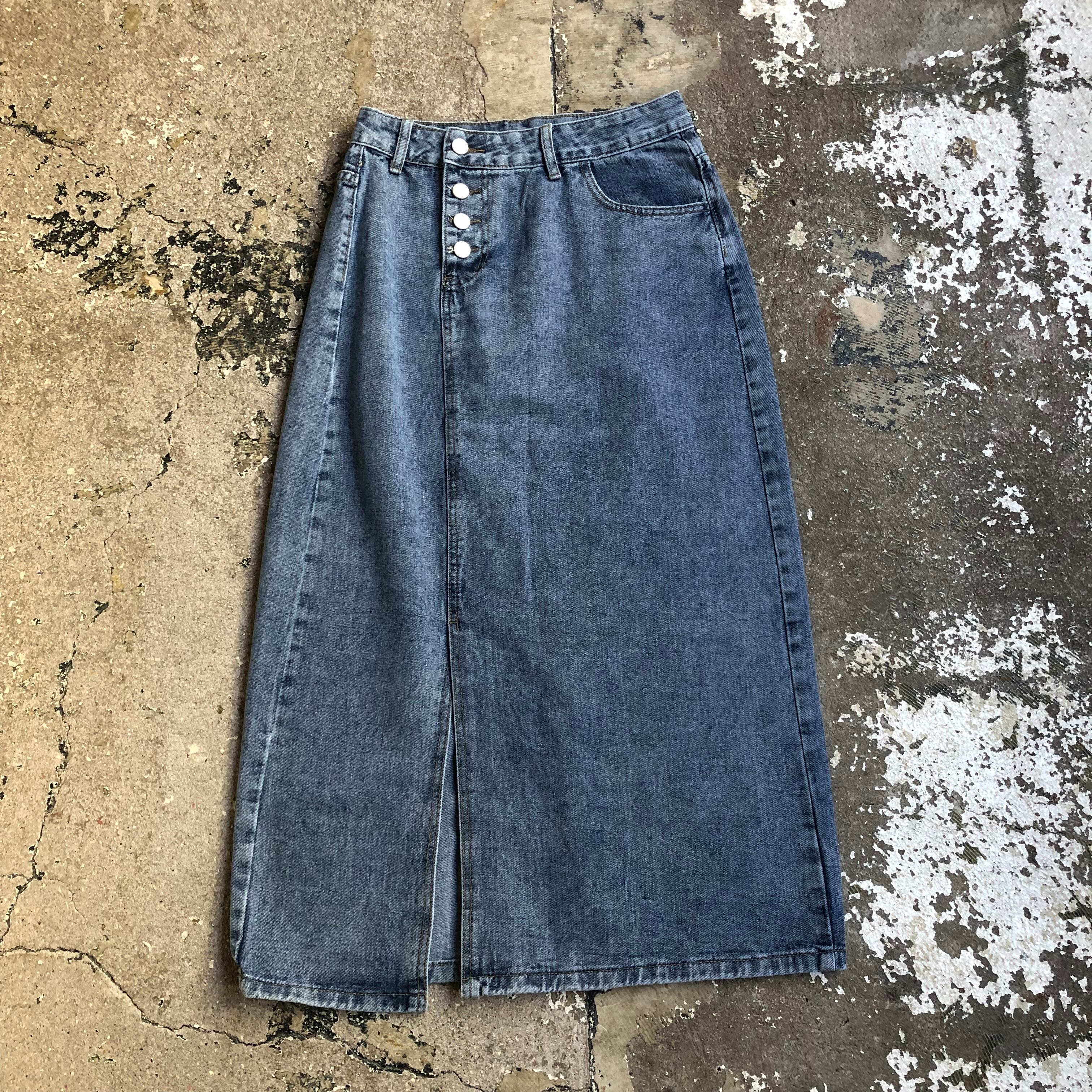 普段使いにもってこいのラフなデニムスカートです。ボタン、スリット位置がややサイドにあるデザインの効いた1枚です。