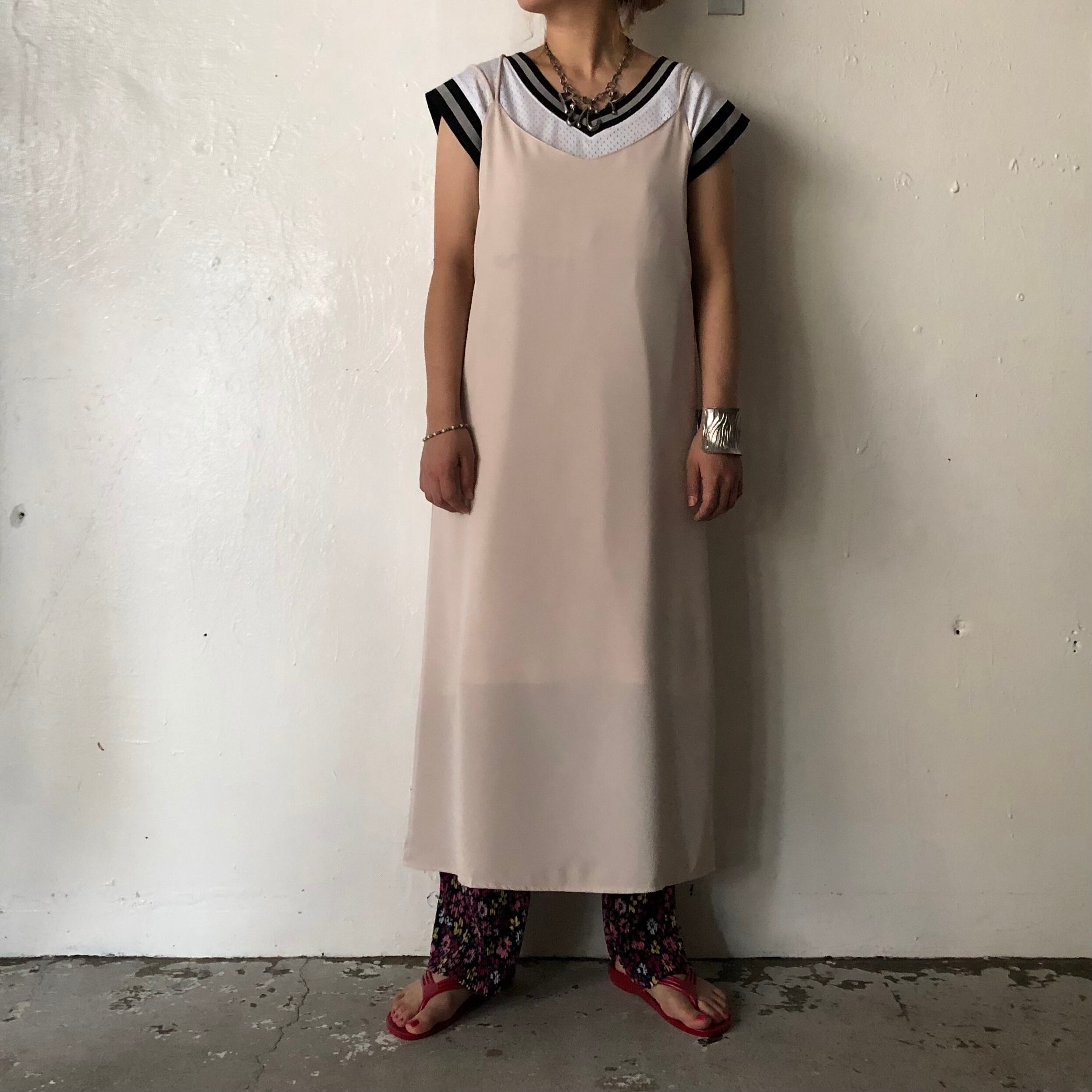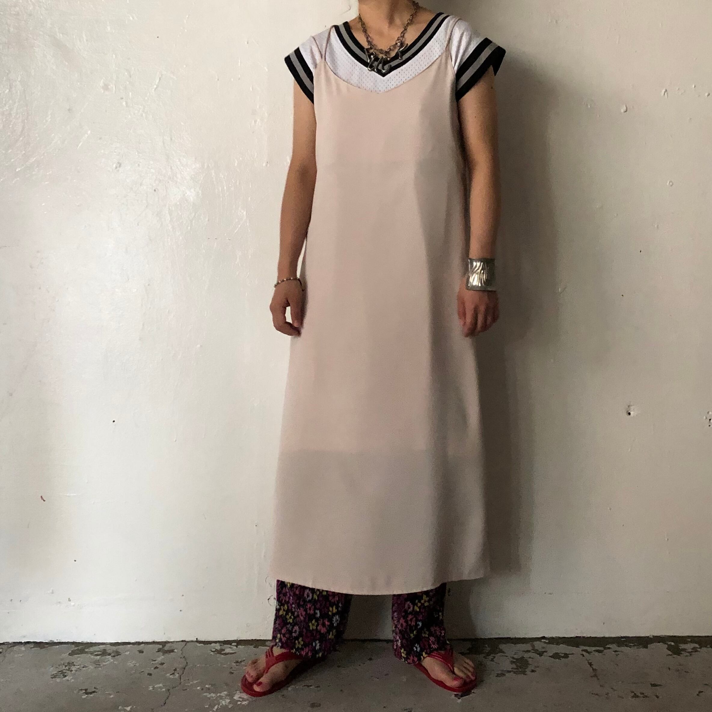 背中のクロスがアクセントになるキャミソールワンピースです。淡い色味が女性らしい印象を与えてくれます。フレアではないボックスラインでレイヤードアクセントにもってこいの1枚です。