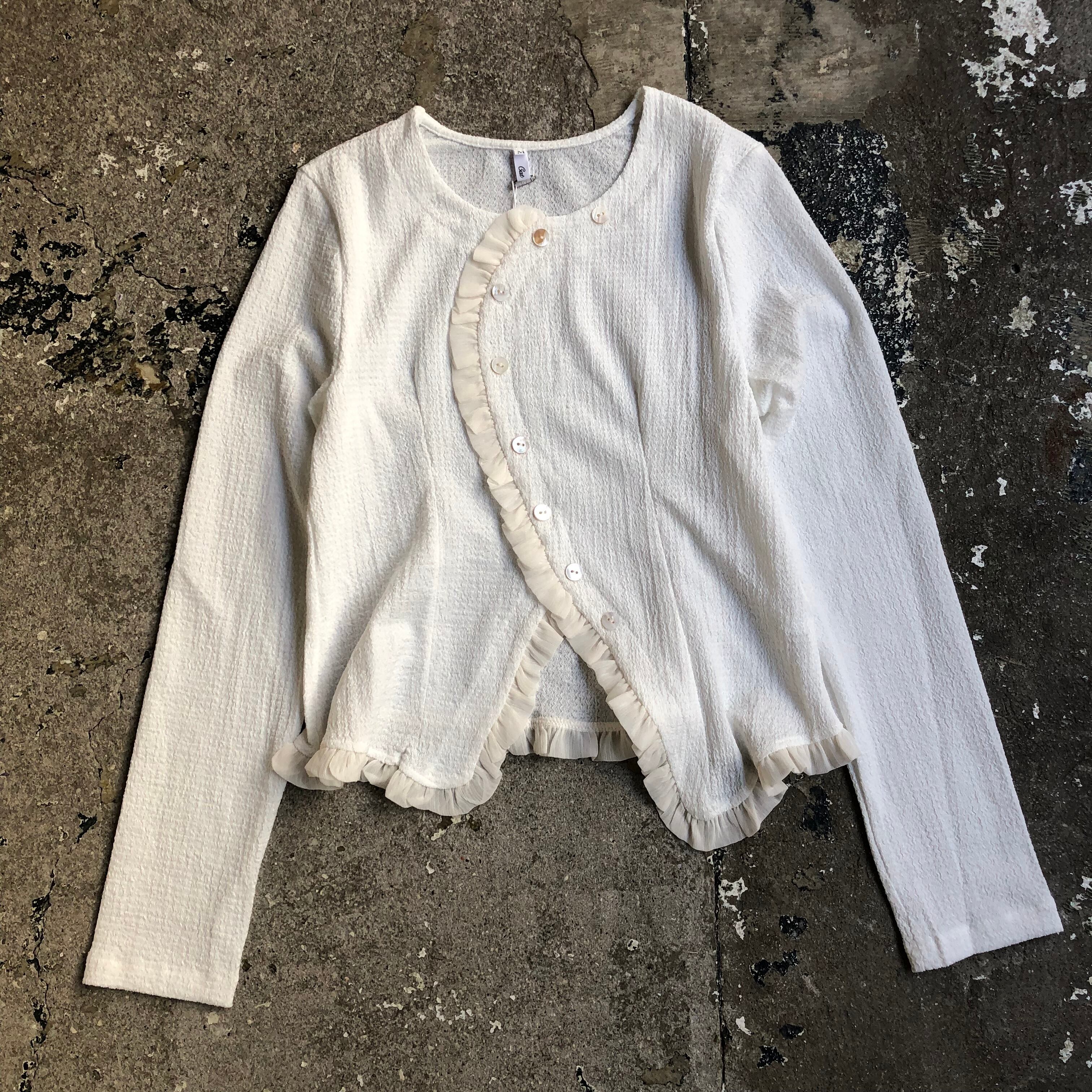 フロント部分にあしらわれたラウンドフリルがアシンメトリーな丈感を演出しており、個性的なフォルムが楽しめます。ちりめんのような伸びのある素材で着心地よい1枚です。