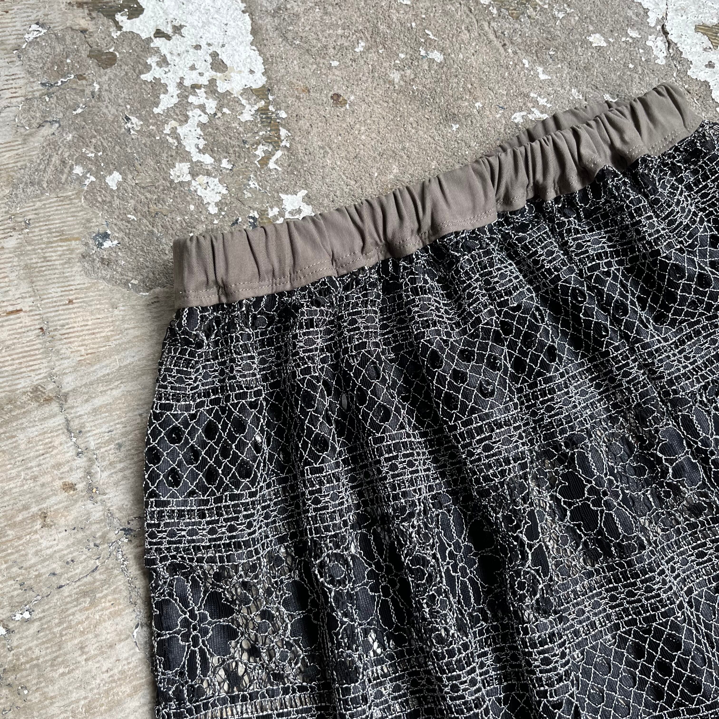 黒のレースに白糸も使われており、立体感のある生地を採用して品のあるスカートが仕上がりました。透け感を楽しめるレイヤードアイテムで、カラーリングの強いボトムやスカートの上から着用いただけます。足捌き良く、広がりすぎないフォルムの一枚です。シーズン長く、コーディネート着用をお勧めいたします。