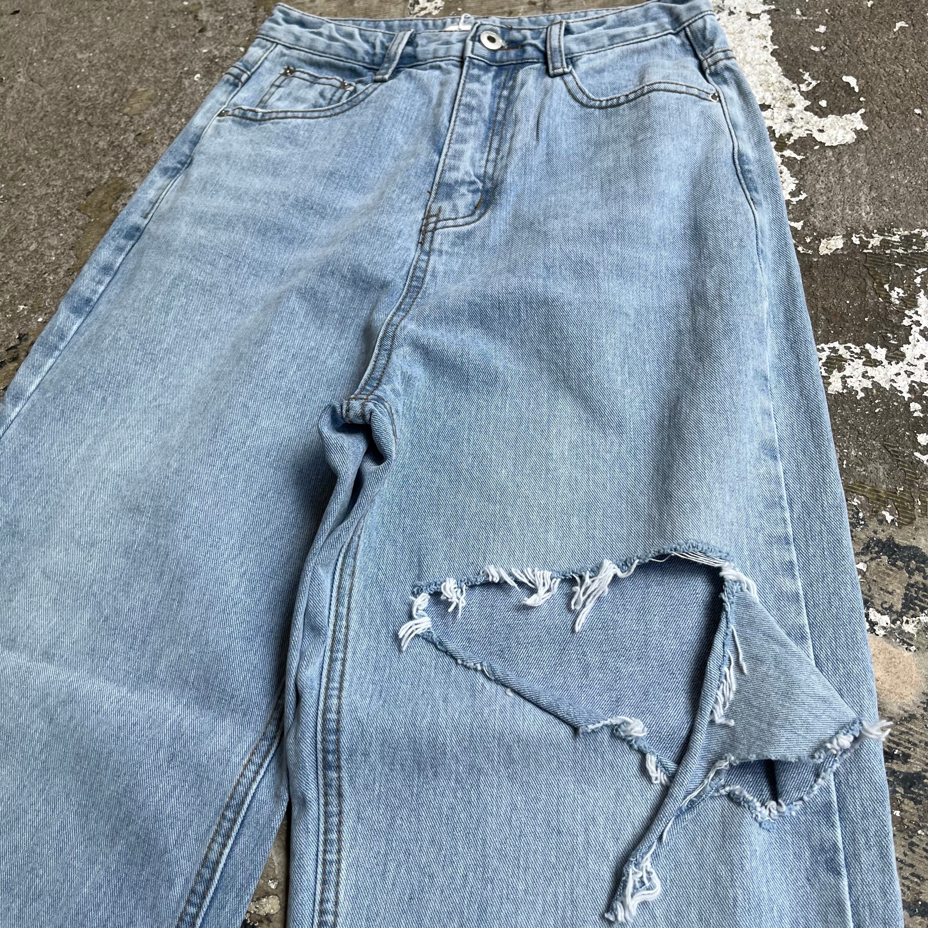 前後にクラッシュの効いたオーバーパンツです。長い丈を大きく曲げても◎