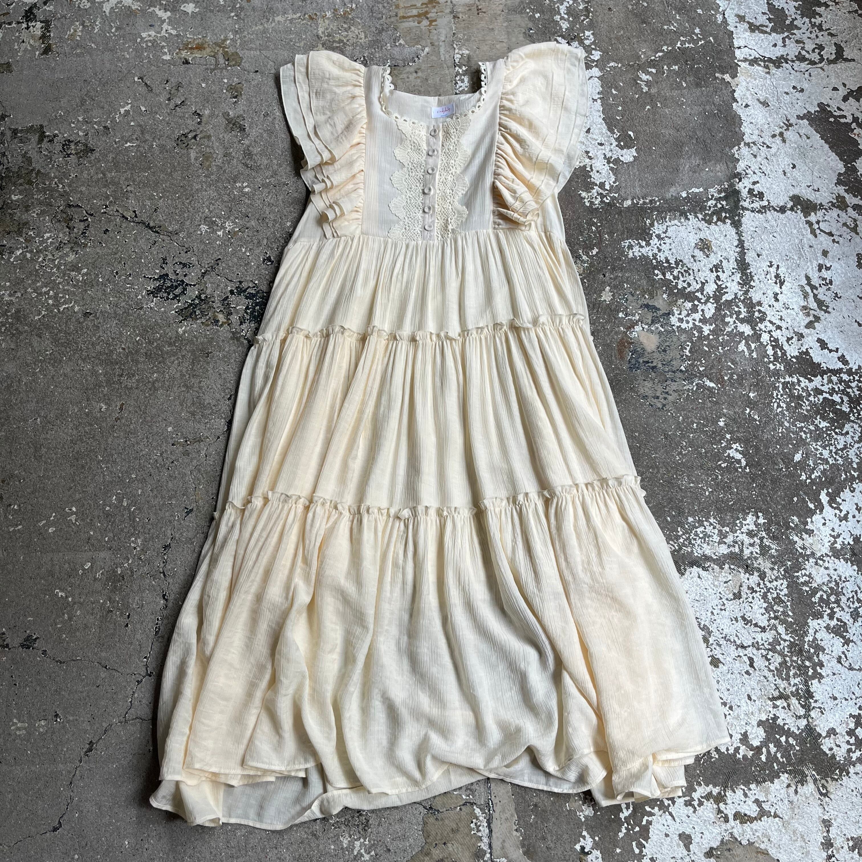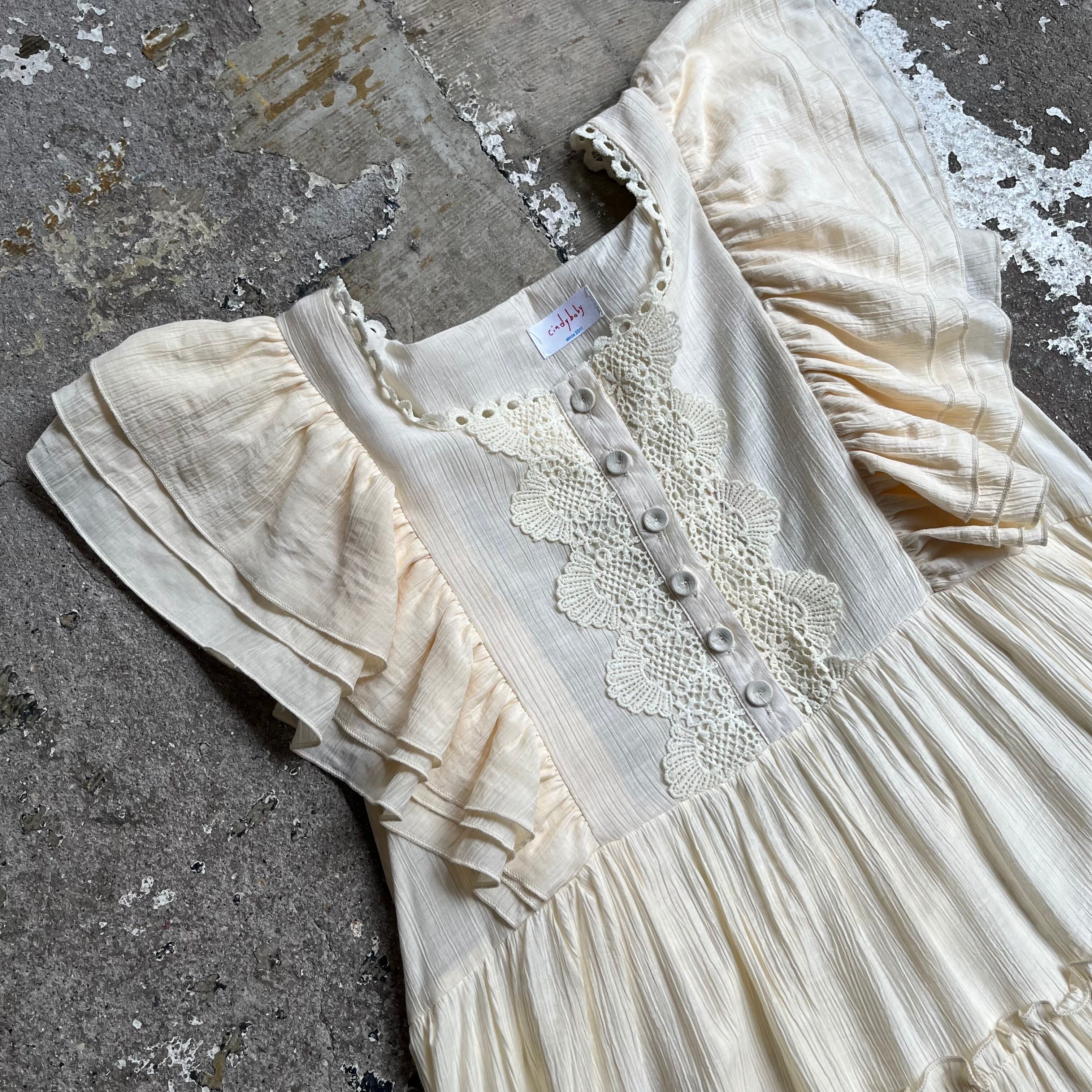ヴィンテージのような雰囲気のあるレトロワンピースです。しわ加工で横伸びのある生地で、ゆったりと着用いただけます。ウエストマーク用のリボンが同生地でセットとなります。