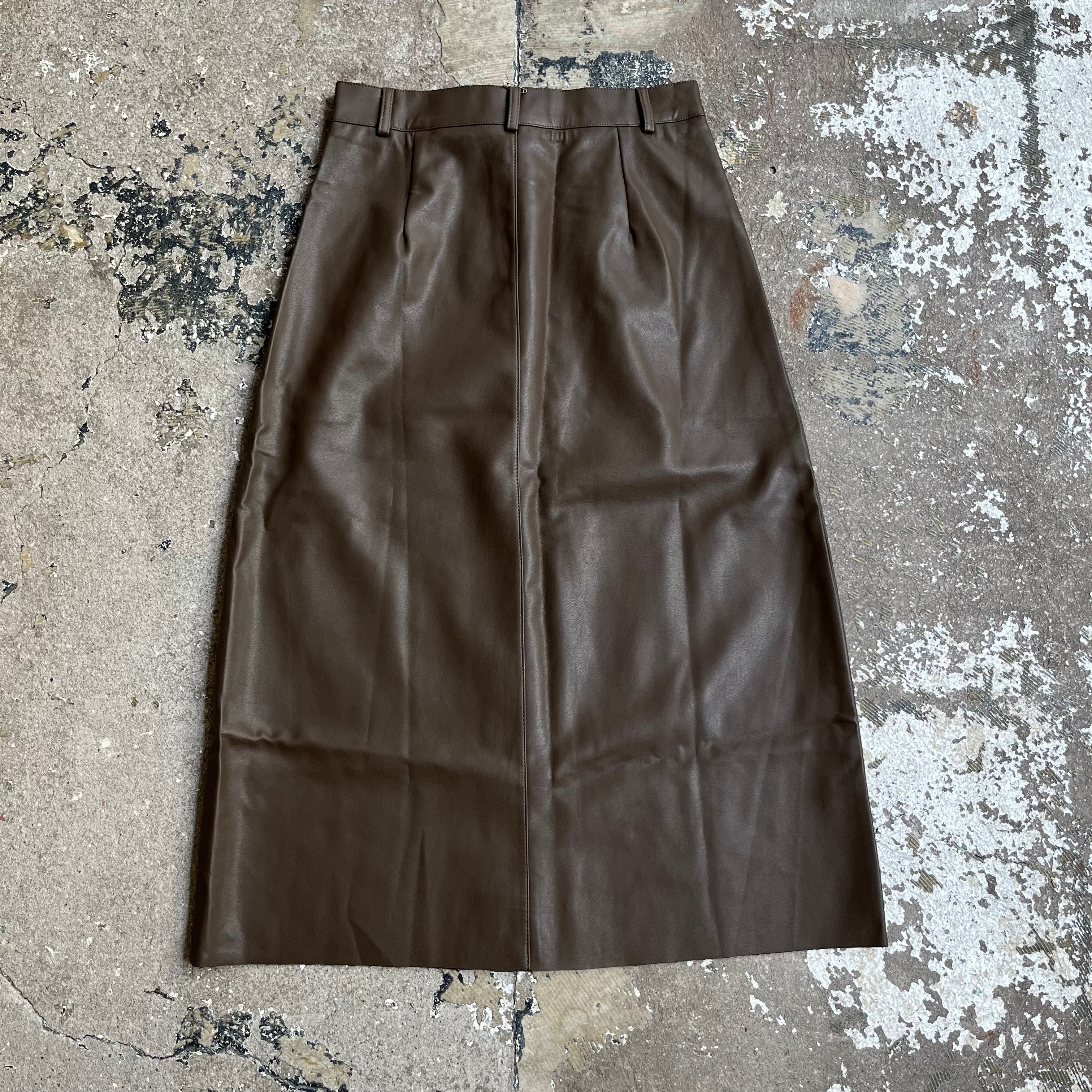 タイトすぎないボックスフォルムのフェイクレザースカートです。厚みがありボディラインを拾わず、やや光沢のある生地の雰囲気が楽しめます。スリーブレストップスからニットプルオーバーまで、季節も長く愛用いただけます。