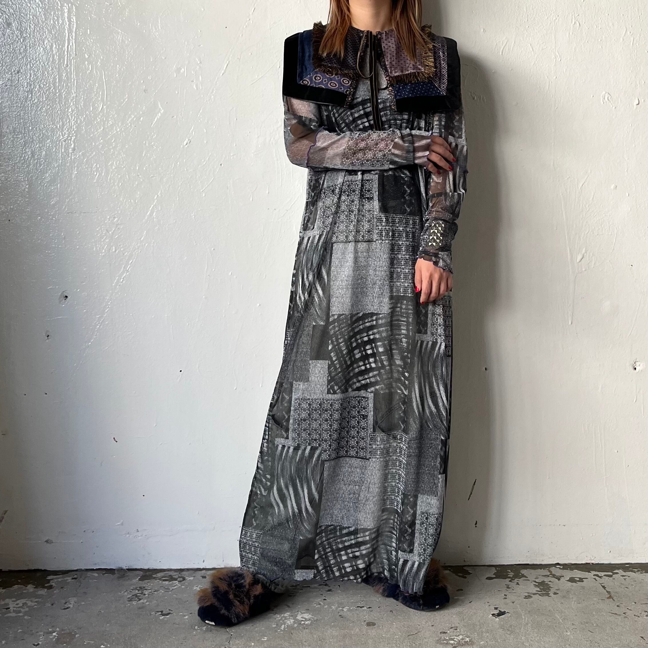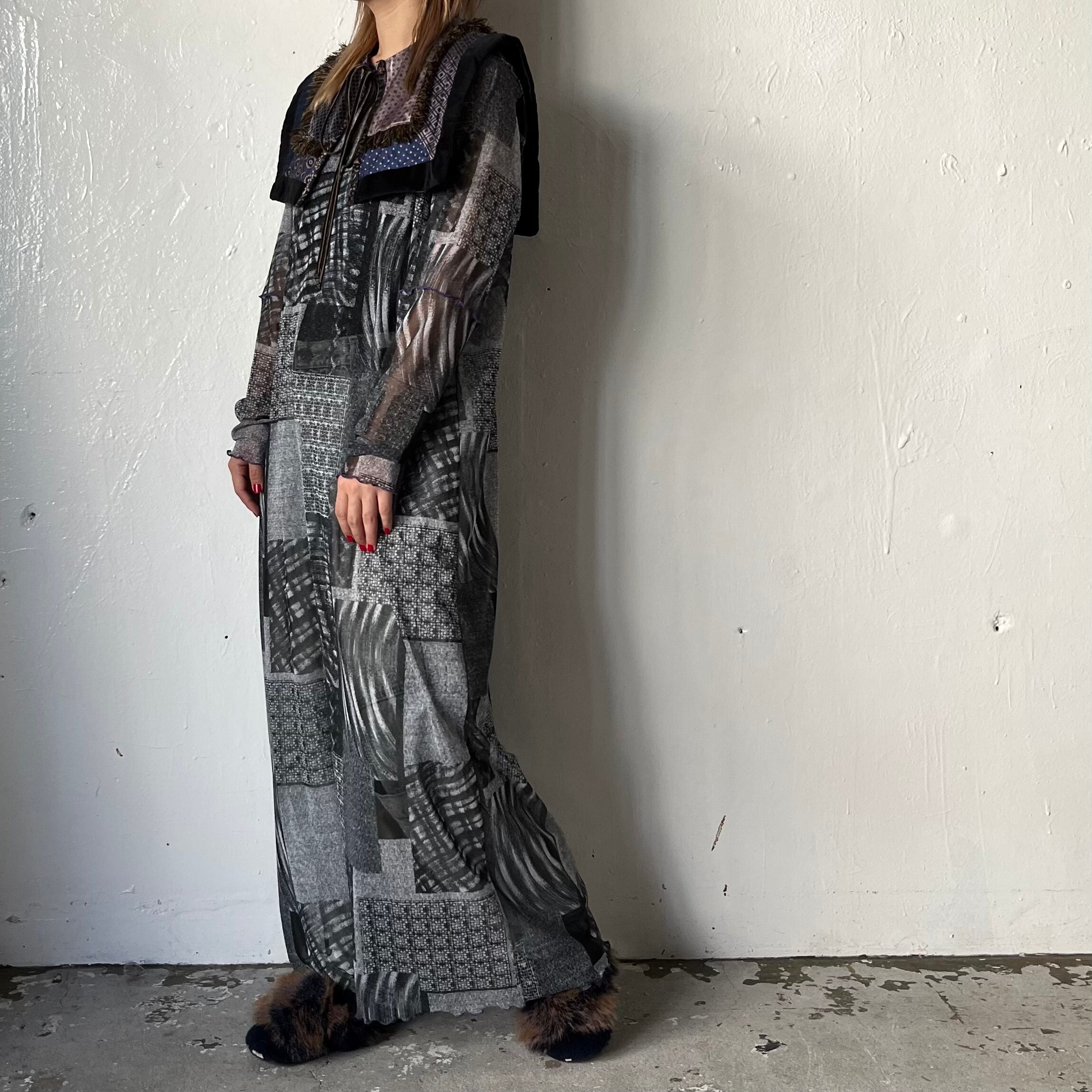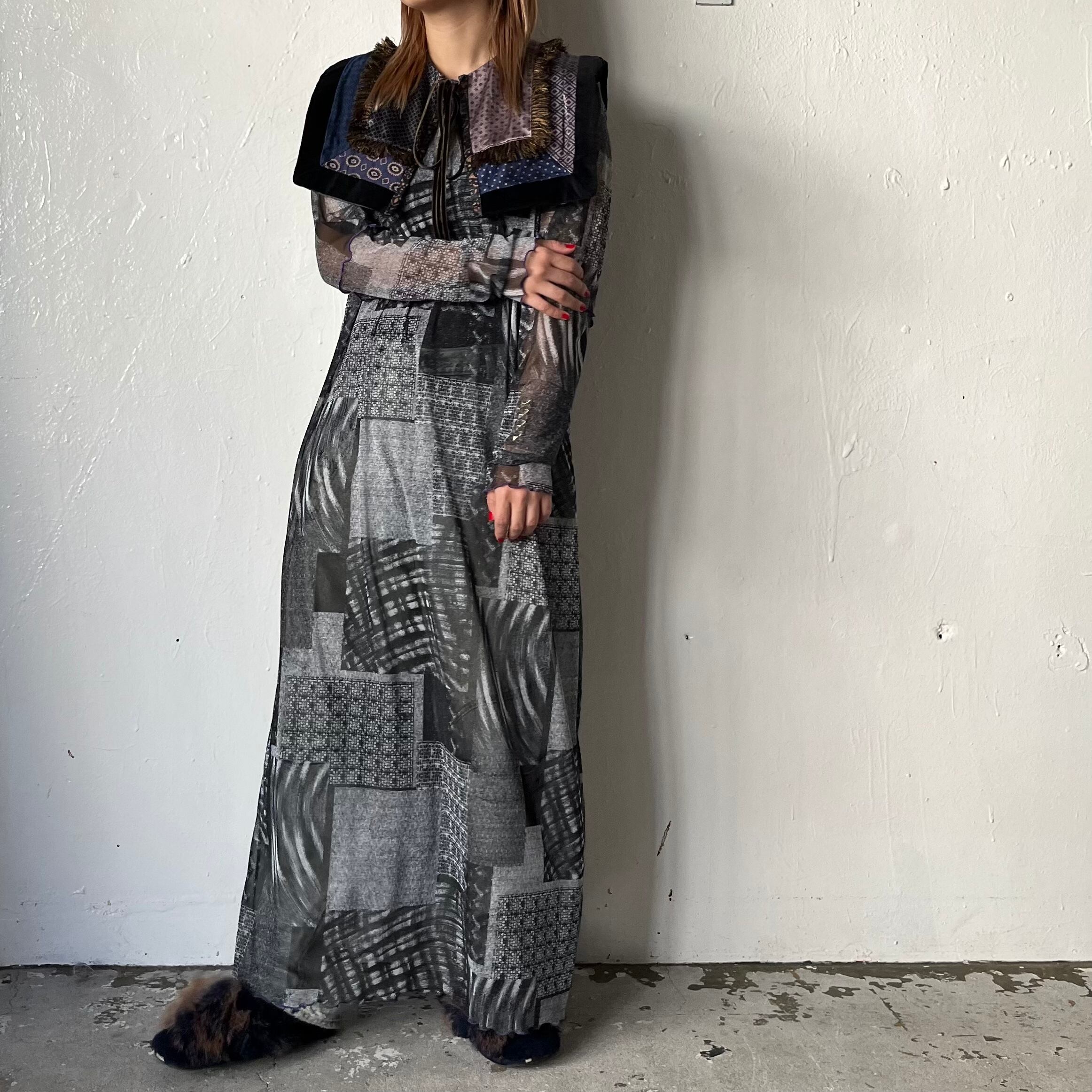 ユーロサテンパジャマの古着をパッチワークして作られたつけ襟です。肩の傾斜に添うように果然を重ね、より付けやすくなっております。成形後の青、その後に紫の染色が施されており、深みのある色味が表現されています。パッチワーク商品のため、同じ柄のない一点ものとなっております。