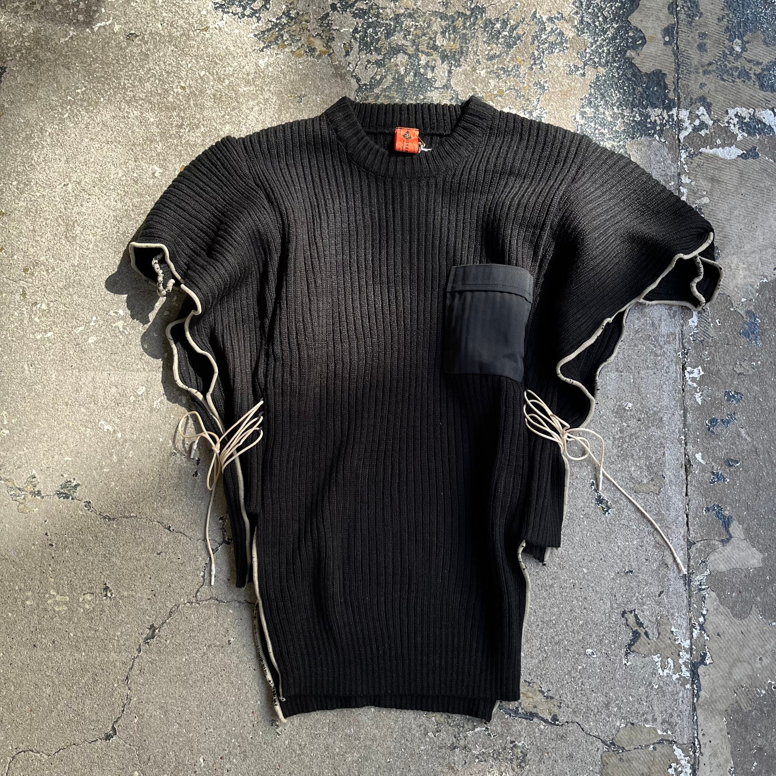 昨年も好評だった軍ものコマンドセーターのリメイクシリーズです。今期はサイドをレースアップしたコマンドセーターのリメイク商品です。シャツやロングスリーブインナーなどを合わせて着用いただけます。巻きロックで演出された縁とサイドのレースアップロープは同色で仕上げられており、個性的でユニークなフォルムもまとまりやすい一枚です。